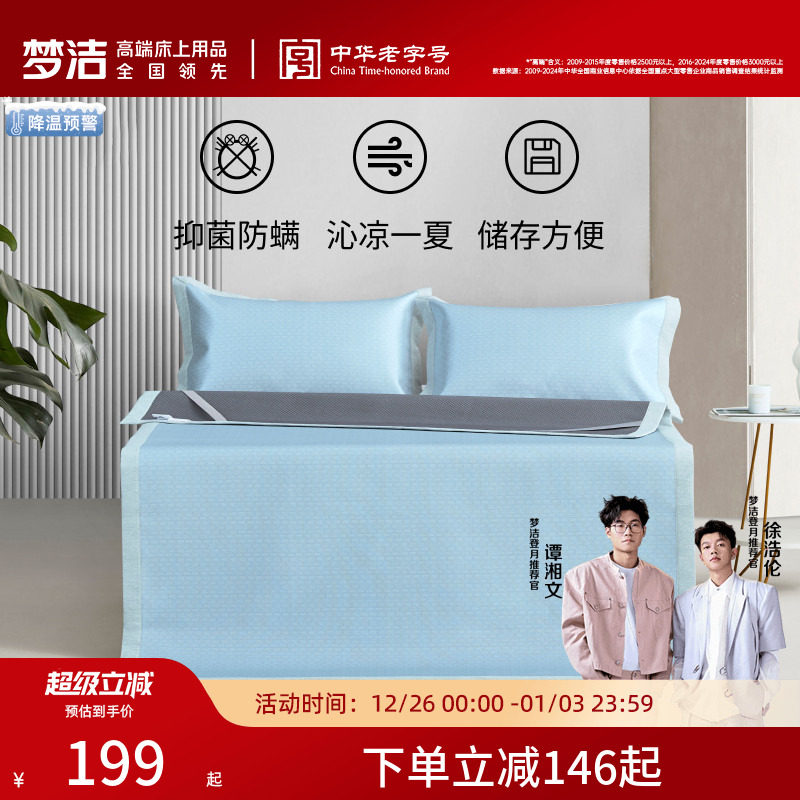 梦洁家纺抗菌冰丝凉席套件三件套床上用品1.8m床软席空调床单席子