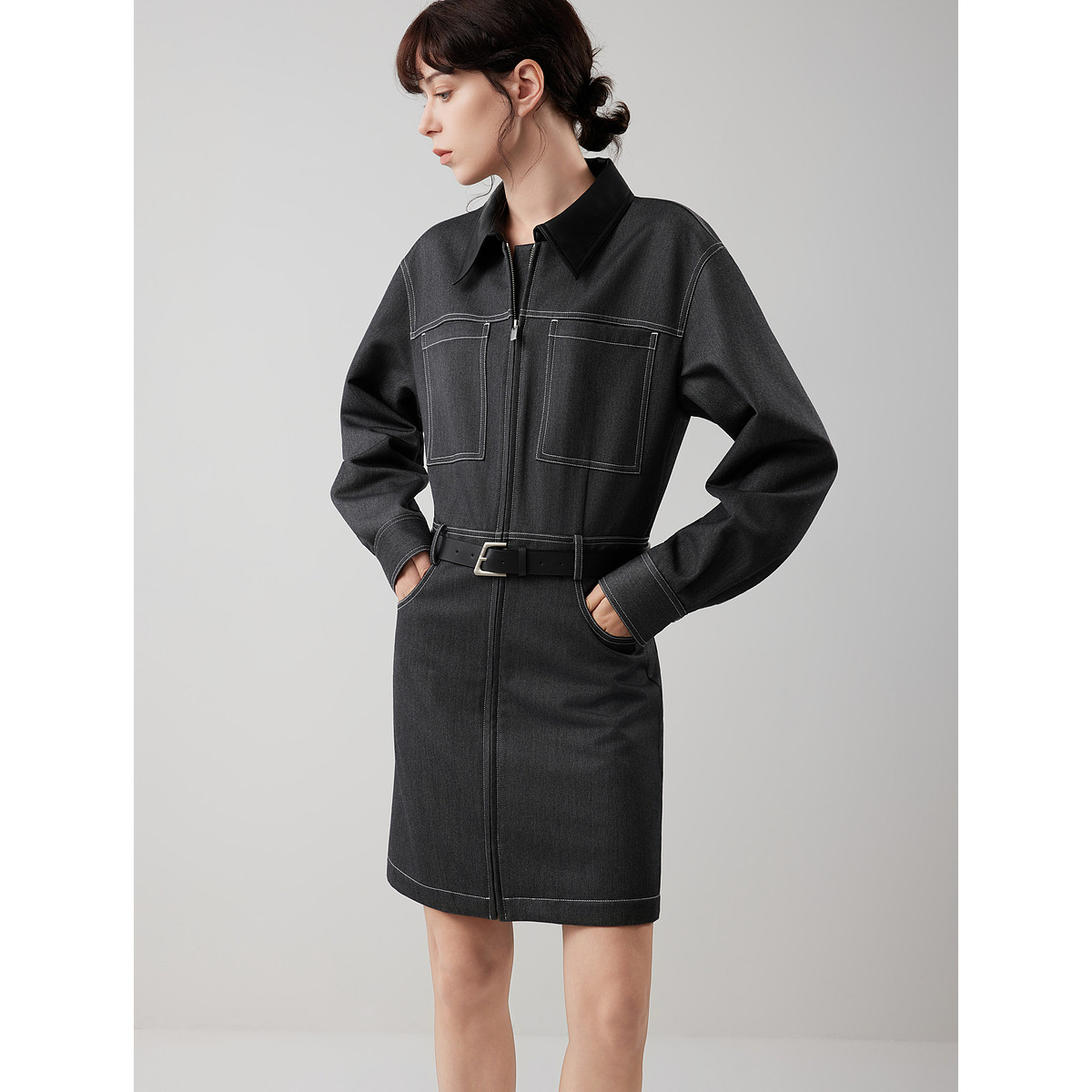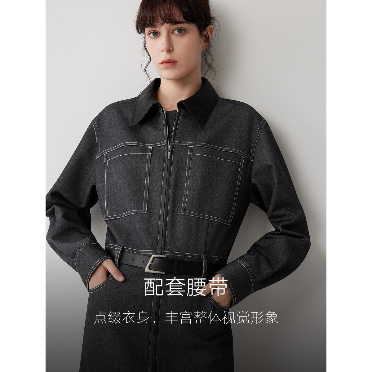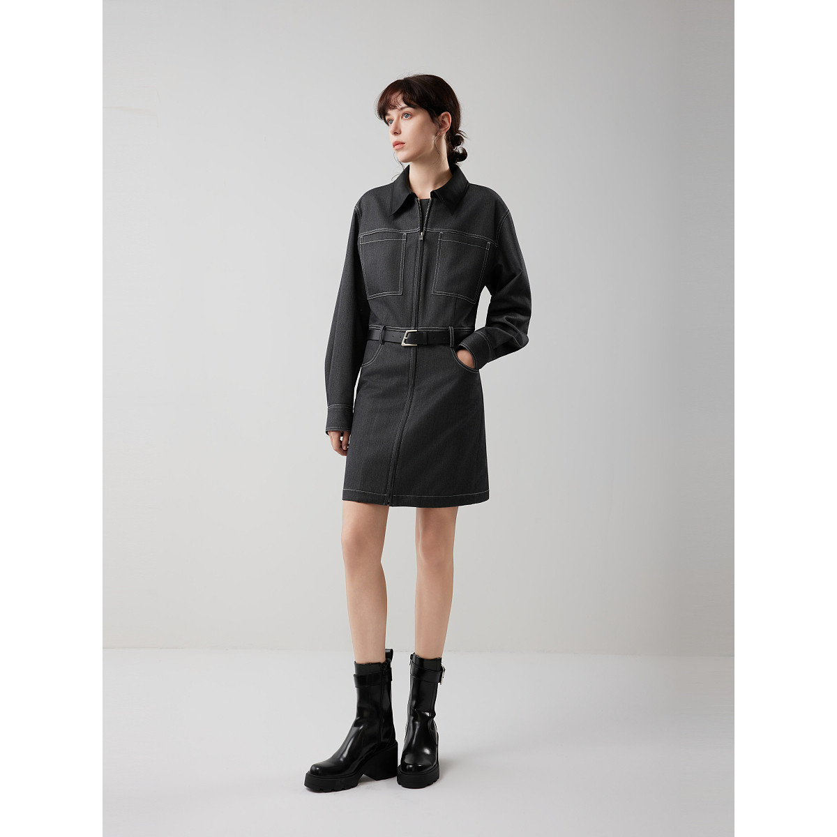 ELLE法式设计感衬衫式连衣裙女2025冬季新款仿牛仔腰带休闲短裙子