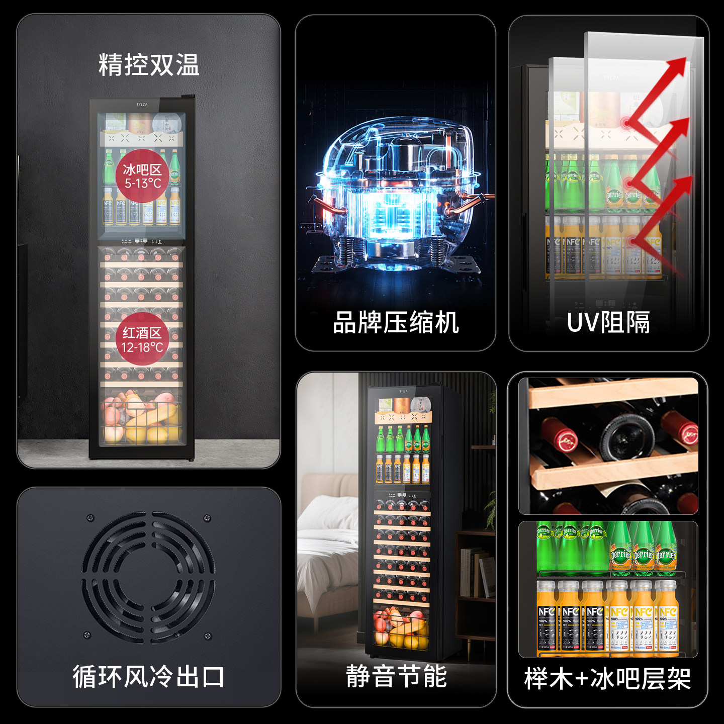 TYLZA恒温红酒柜家用客厅冷藏保鲜风冷无霜双温冰吧茶叶柜TW208