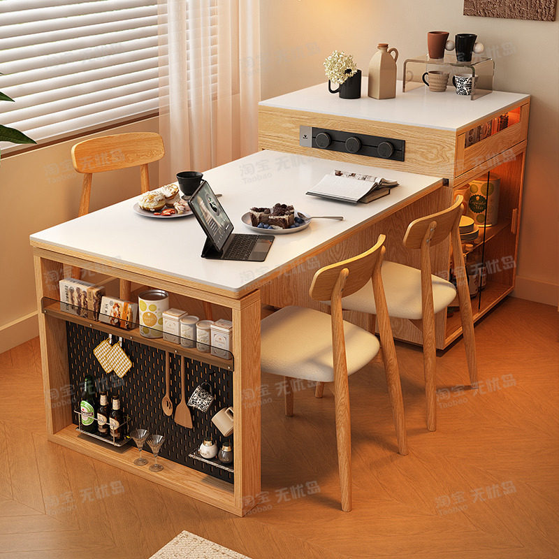 实木岛台餐桌现代简约家用伸缩一体饭桌小户型原木风吧台餐边柜