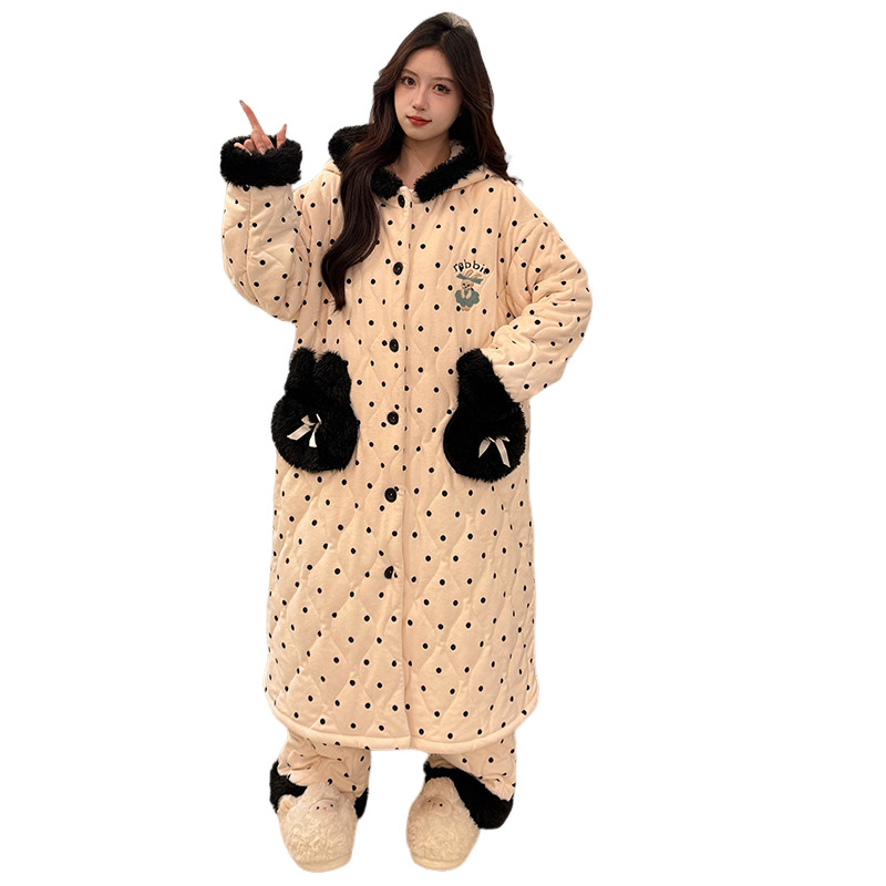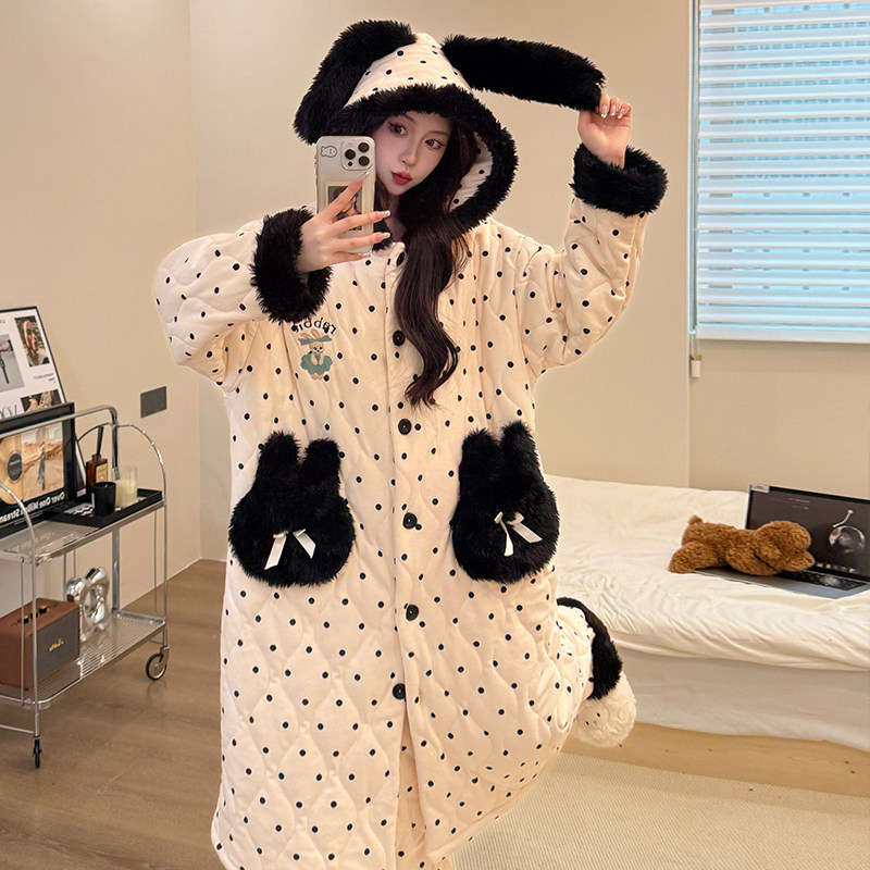 冬季波点兔耳朵睡袍女三层夹棉加绒加厚睡衣女士可外穿长款家居服