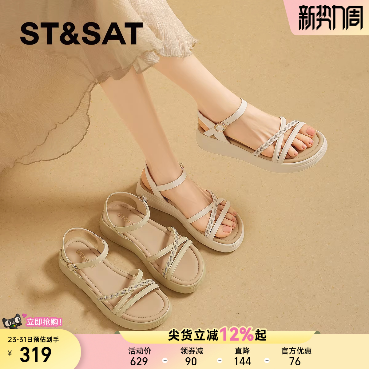 星期六仙女风一字带厚底凉鞋女2026夏季新款坡跟软底休闲罗马凉鞋