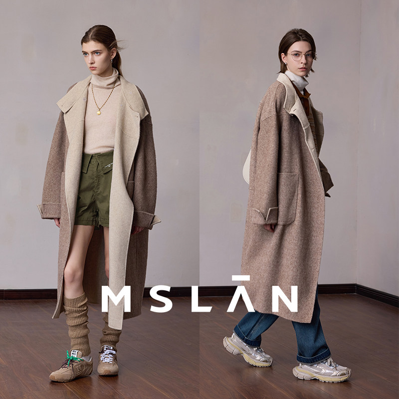 轻盈锁暖/MSLAN慵懒风羊毛混纺线条毛呢大衣立领撞色双面呢外套