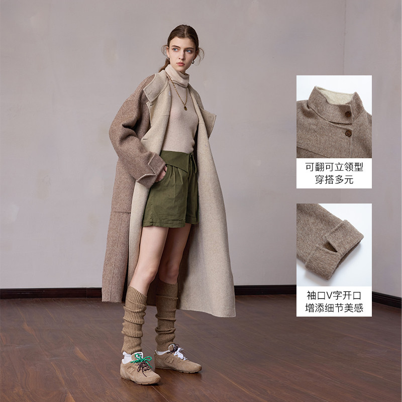 RUISHI芮时重磅驼绒桑蚕丝羊毛慵懒两穿领灰色毛呢大衣秋冬外套女