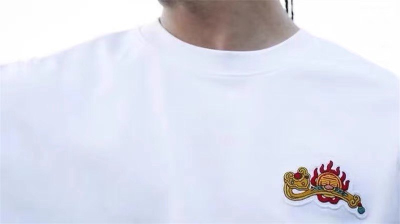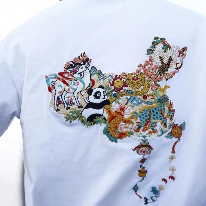 2024夏季短袖纯棉100%上衣国潮白色刺绣T恤男熊猫圆领体恤中国风