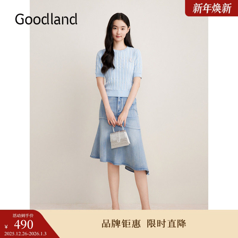 Goodland美地夏季法式不规则鱼尾下摆丹宁牛仔半身裙