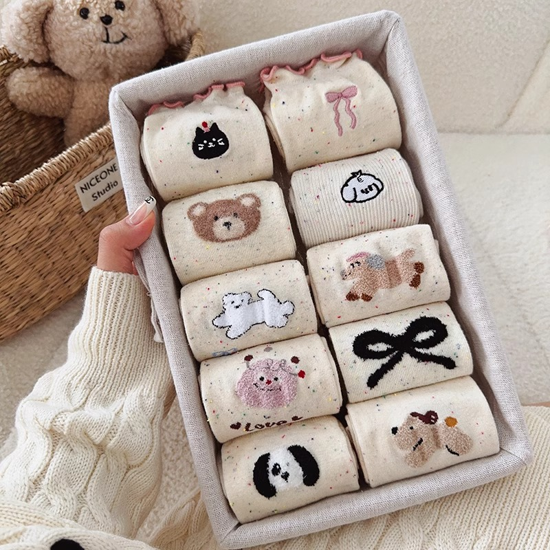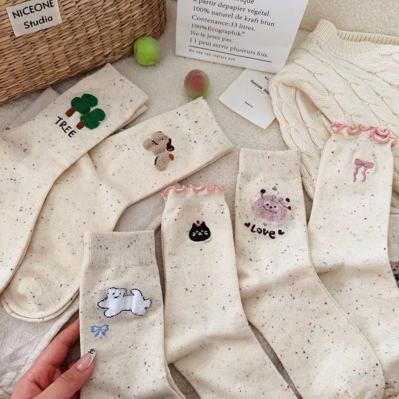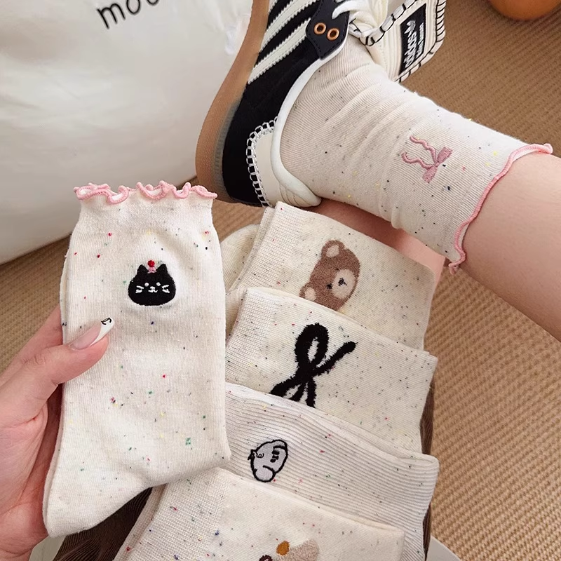 可爱卡通袜子女中筒袜秋冬ins潮2025新款爆款女士白色木耳边长袜