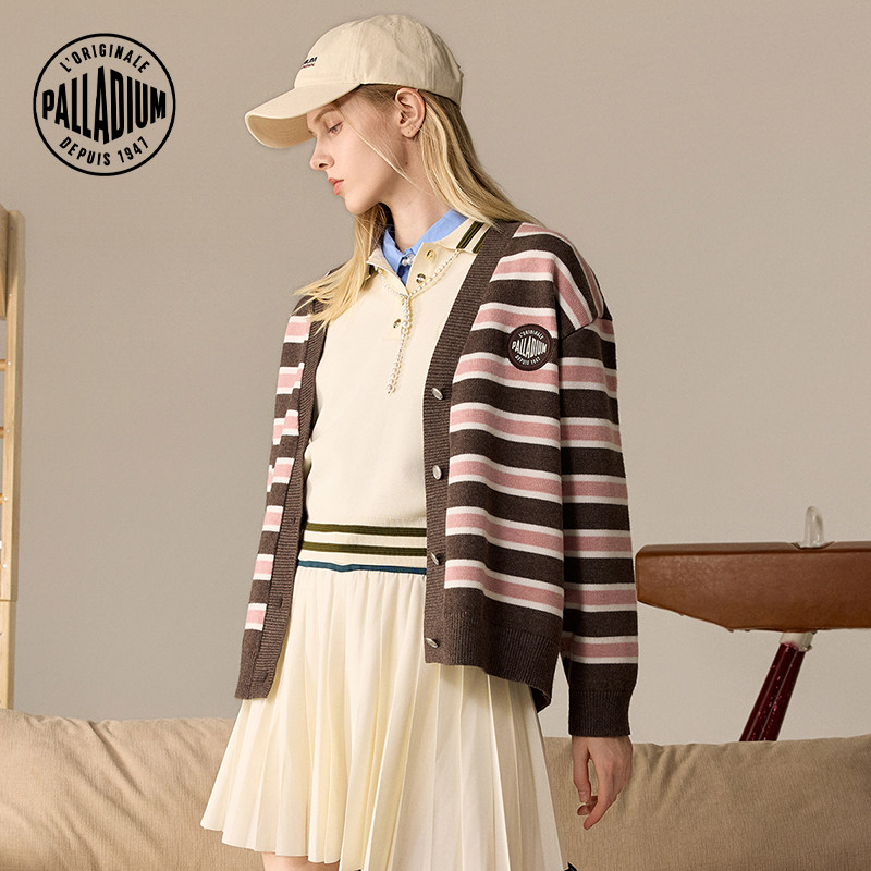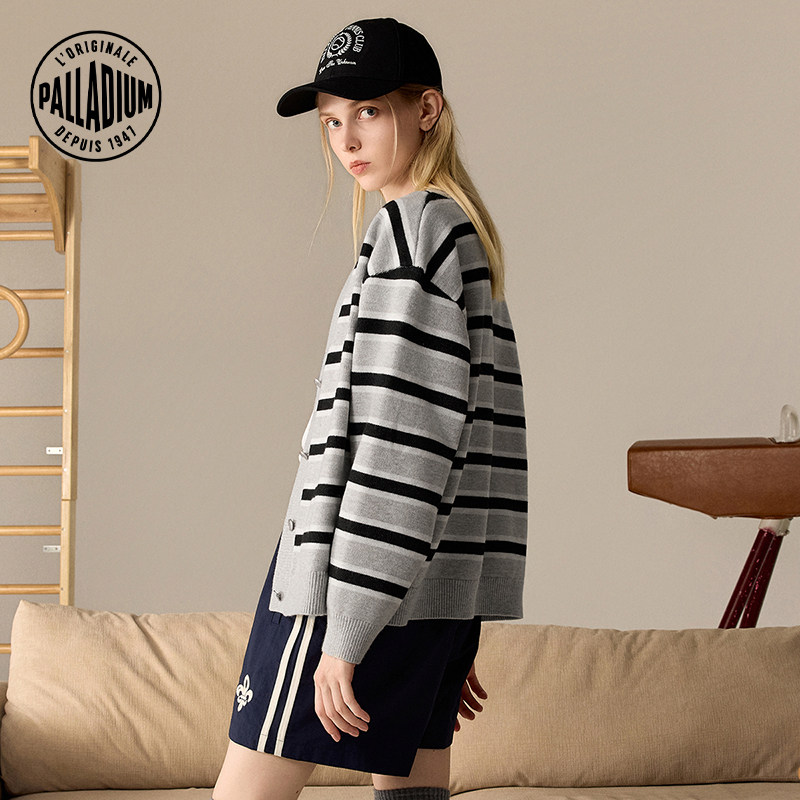 PALLADIUM帕拉丁撞色条纹复古运动百搭女款开襟毛衫外套1912598