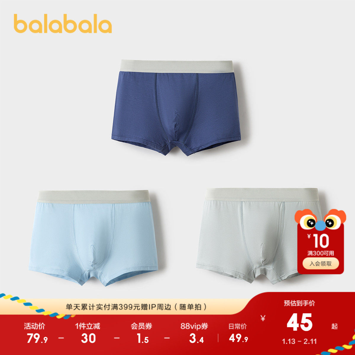 【balaOne】巴拉巴拉儿童内裤棉男童不夹pp抗菌裆四角短裤三条装