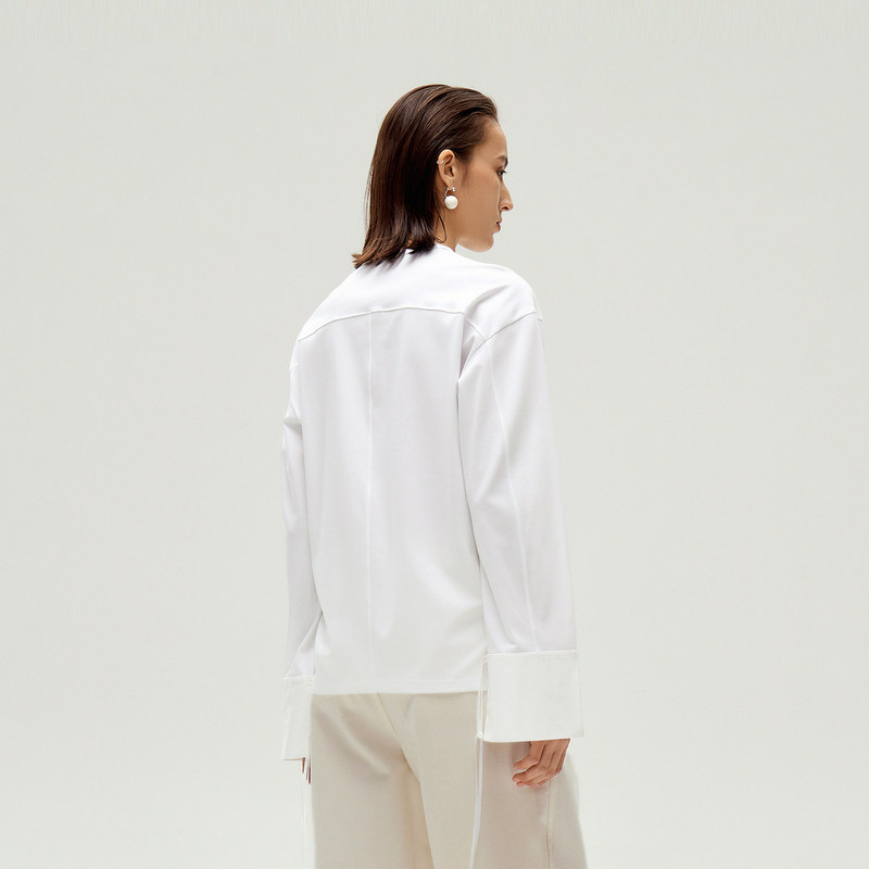 蕉下亨利衫女长袖T恤v领秋冬修身保暖低领打底衫半开领白色上衣