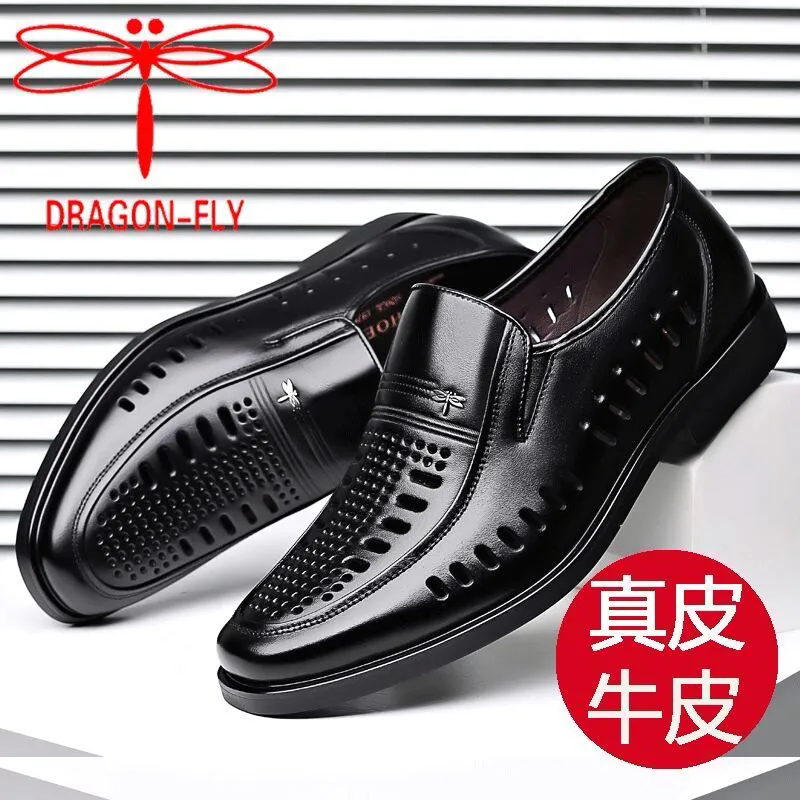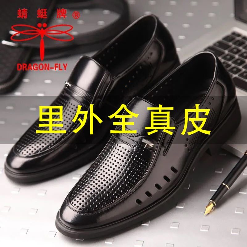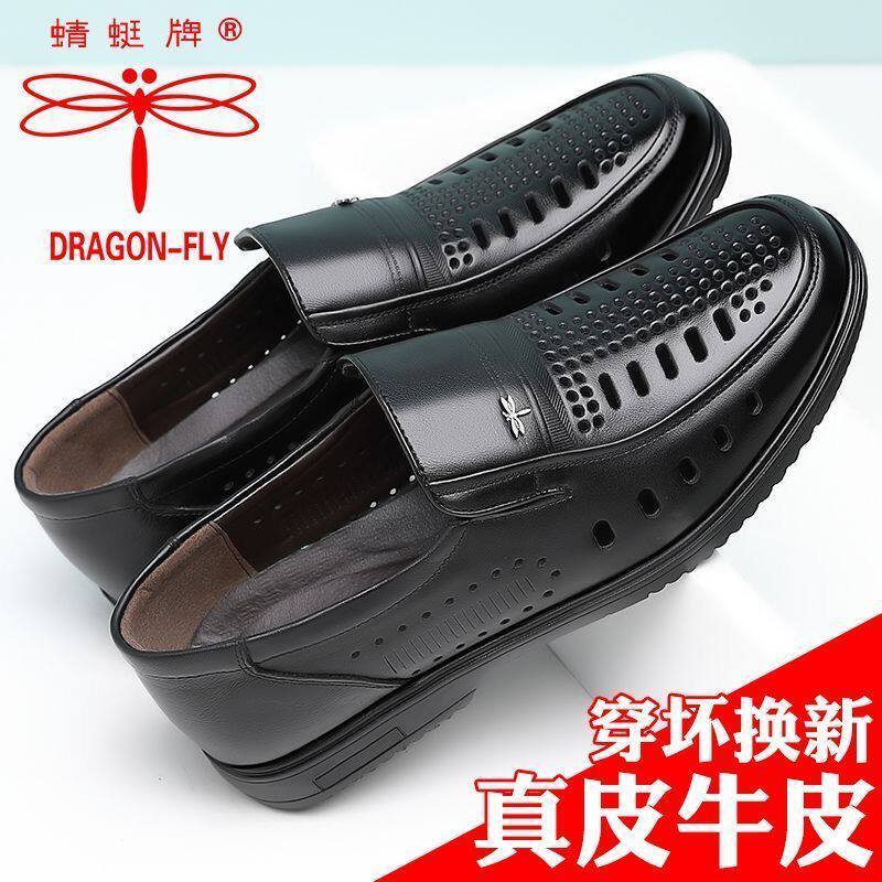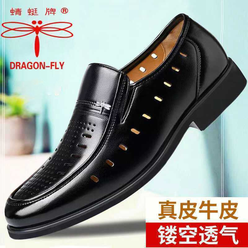 蜻蜓牌真皮商务皮鞋男士凉鞋夏季镂空透气软底中老年爸爸鞋休闲