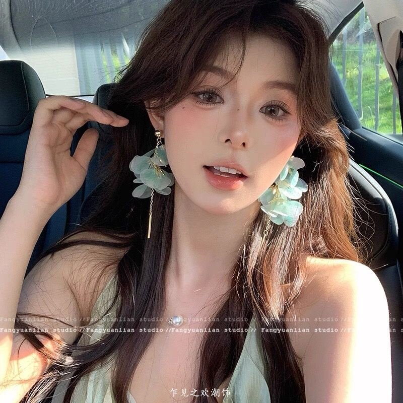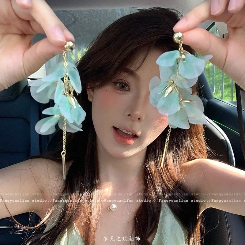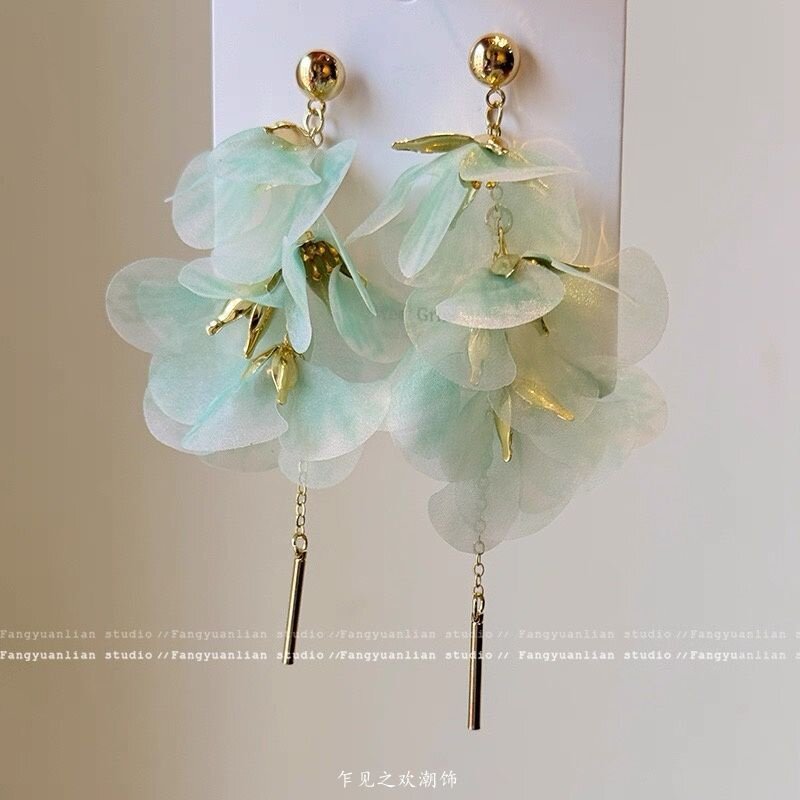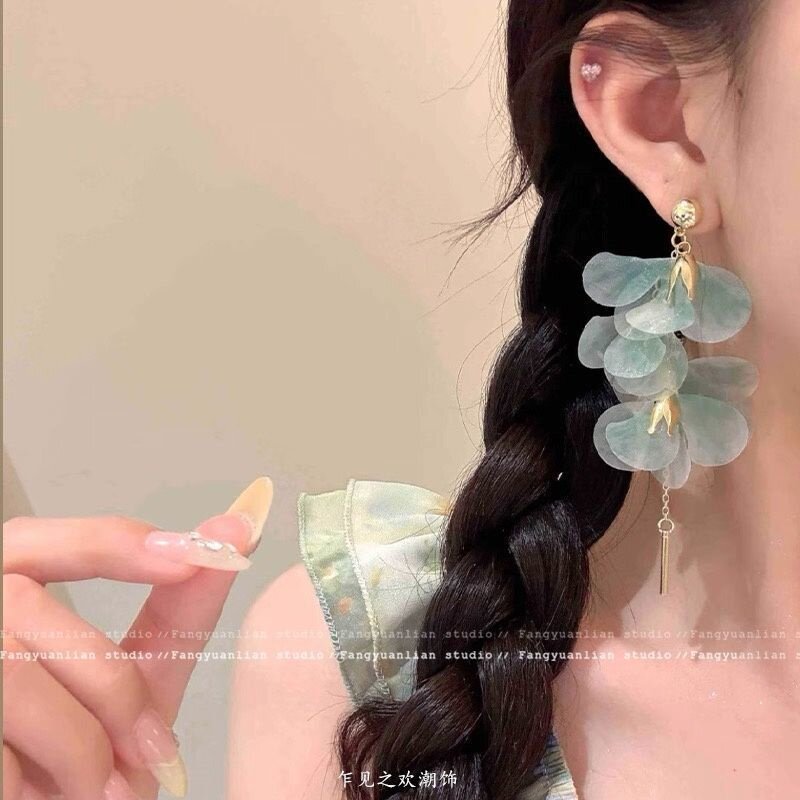 美丽轰鸣紫色网纱流苏花朵耳环女气质长款耳坠耳钉独特夸张耳饰