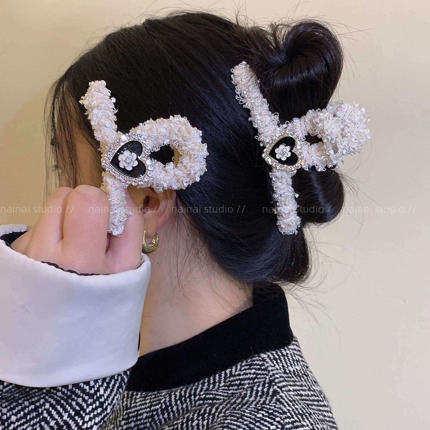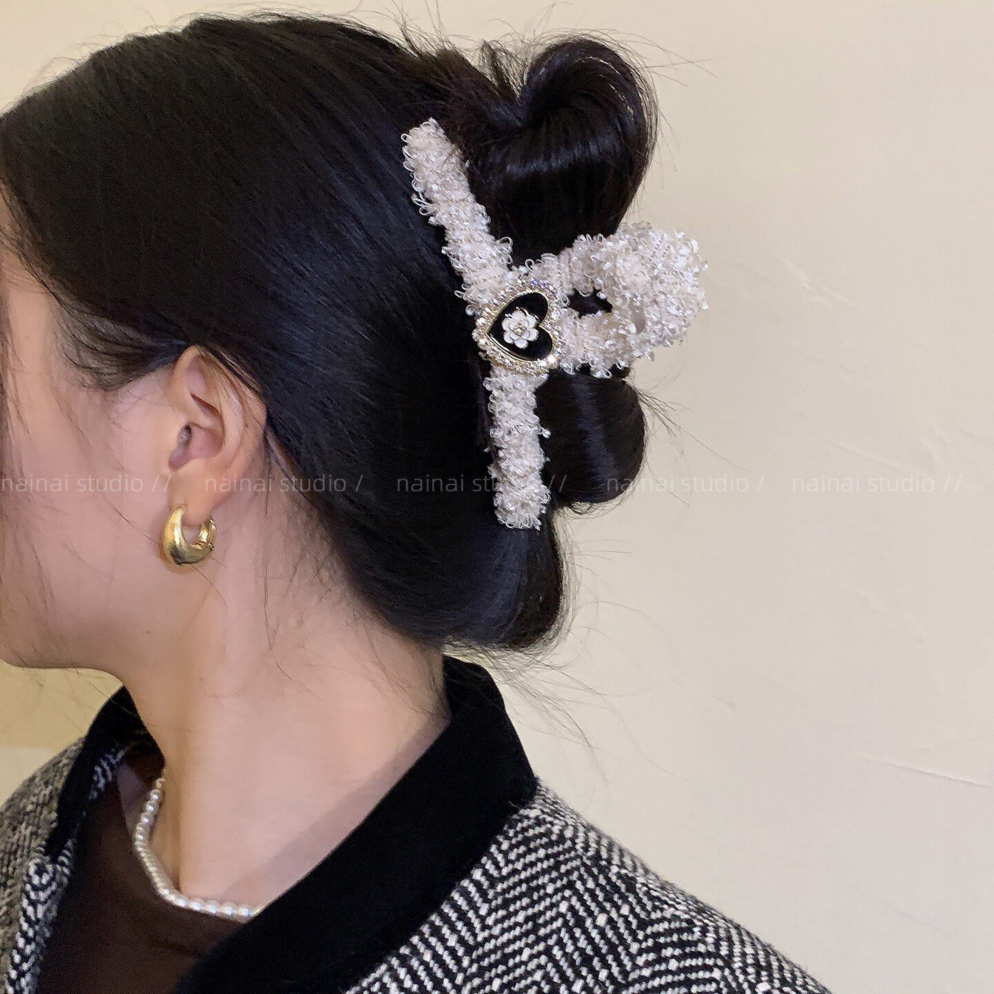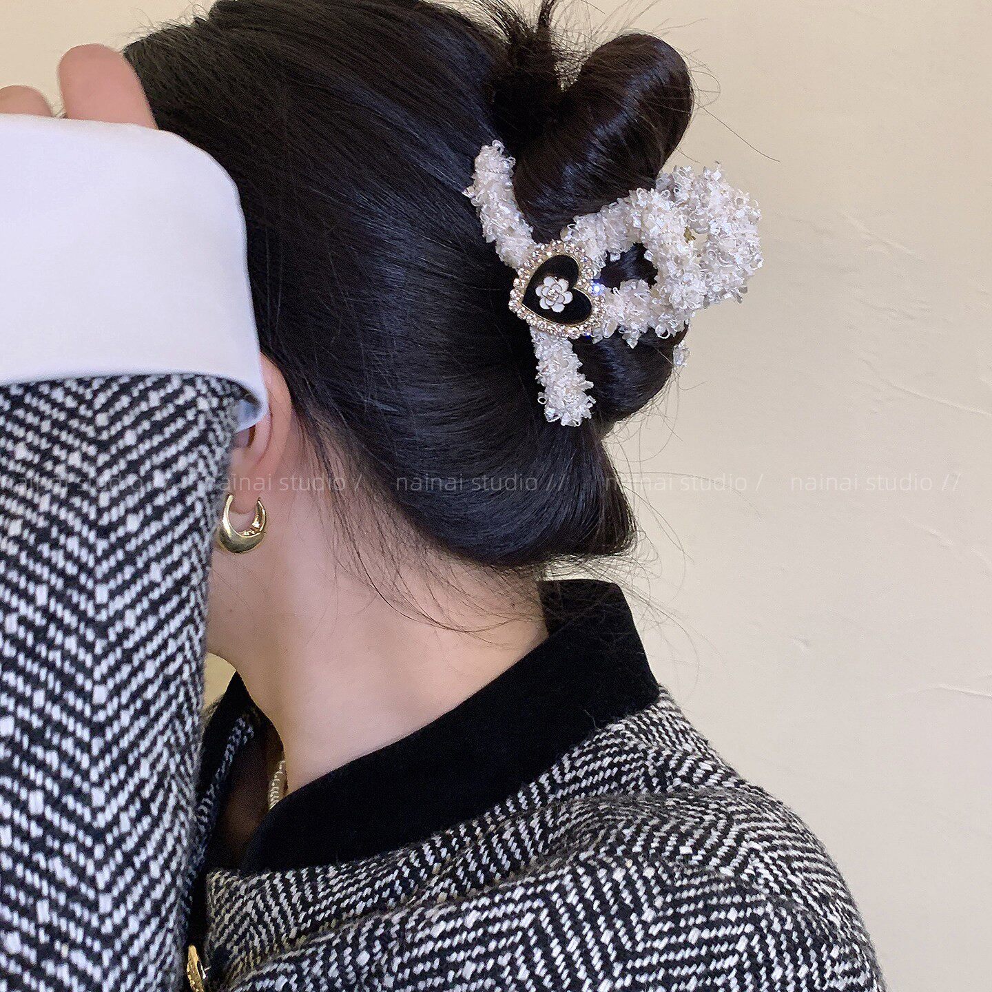 小香风粗花呢抓夹~复古法式宫廷风爱心山茶花后脑勺盘发鲨鱼夹女A