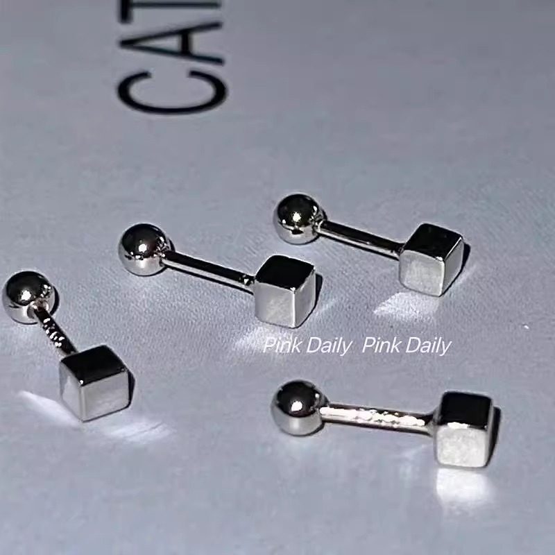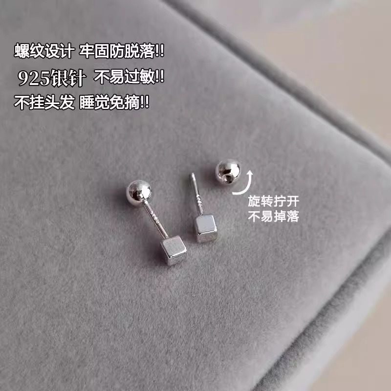 简约小方块耳钉925银针2024新款爆款养耳洞螺丝拧睡觉免摘耳骨钉