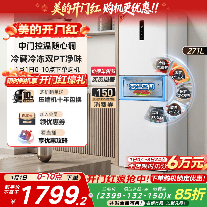 美的283三开门电冰箱一级能效家用变频风冷无霜小型超薄官方租房
