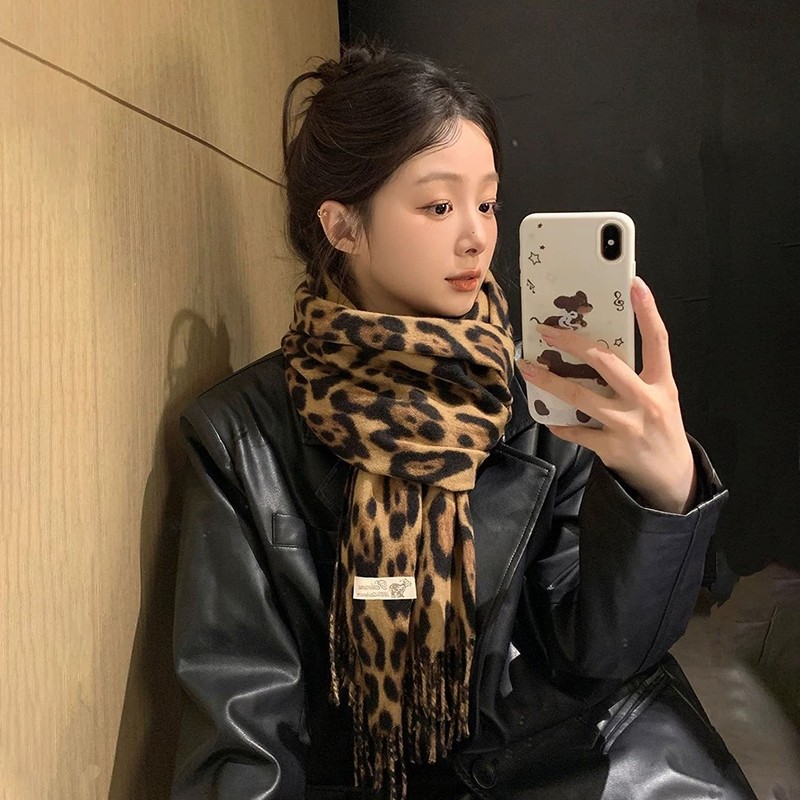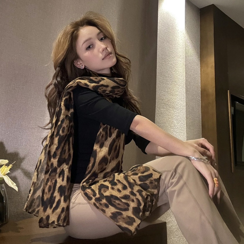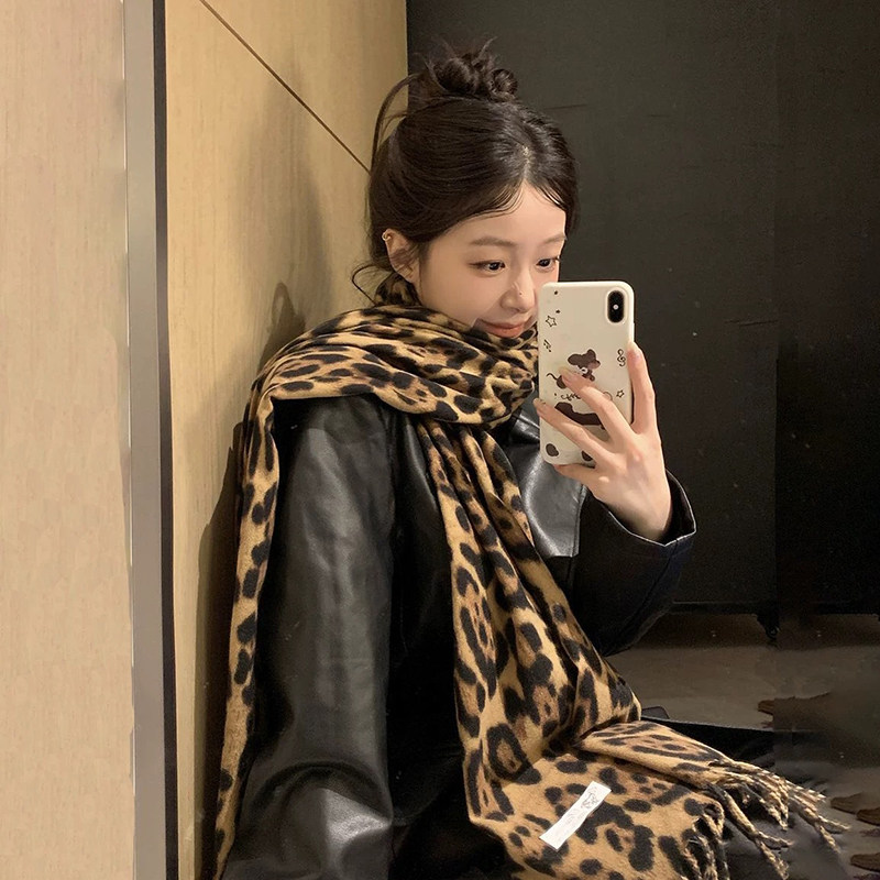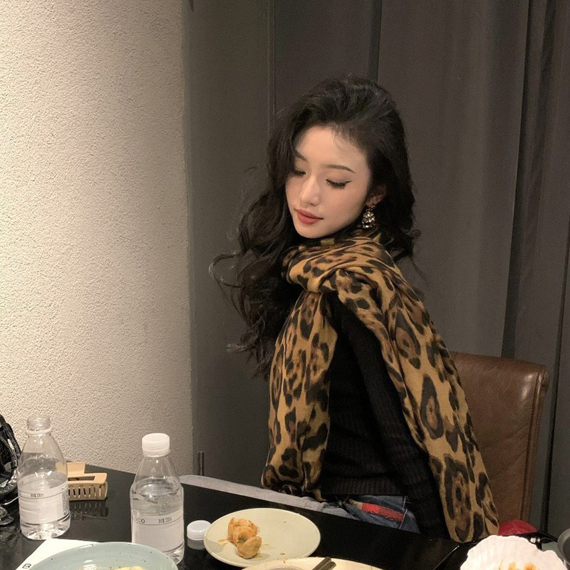 豹纹围巾女款2024新款秋冬季复古丝巾韩系氛围感披肩围脖两用保暖