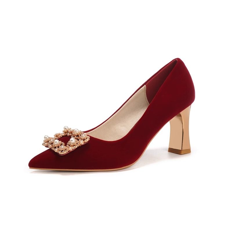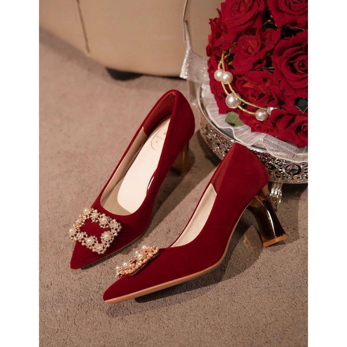 珍珠方扣红色秀禾婚鞋女粗跟不累脚中式敬酒高跟新娘鞋订婚配旗袍