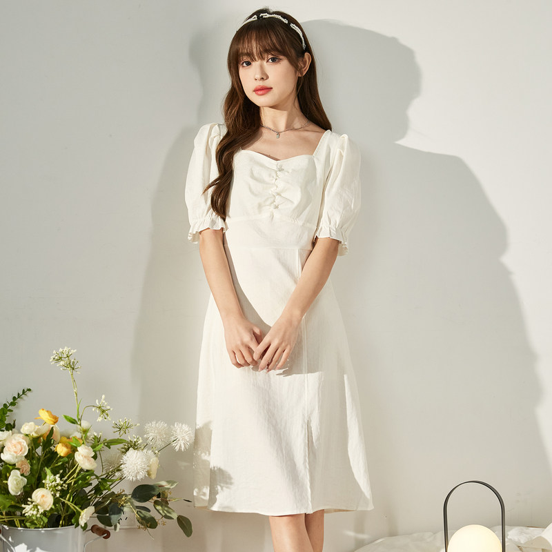 唐狮夏装法式连衣裙女装气质中长款淑女设计感开叉青少年裙子潮