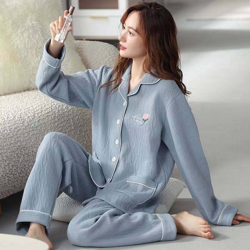 秋冬三层空气棉睡衣女加厚100纯棉家居服夹棉套装可外穿开衫上衣