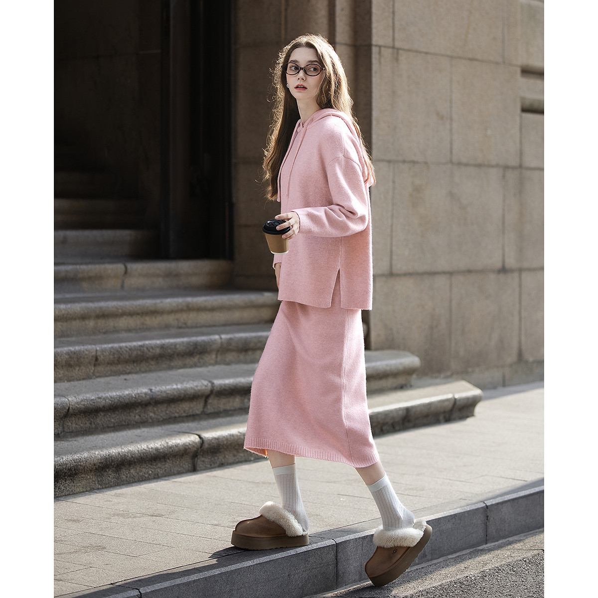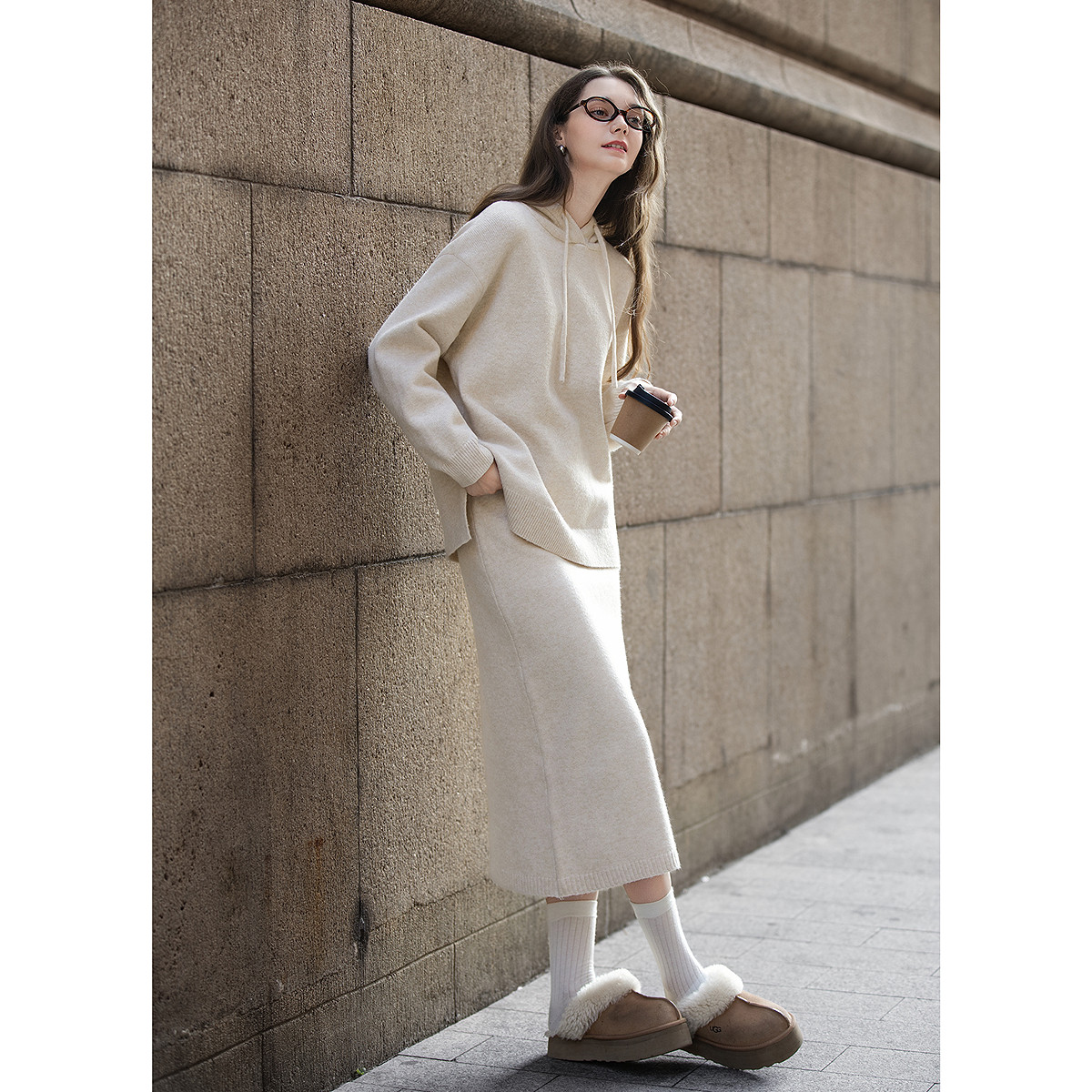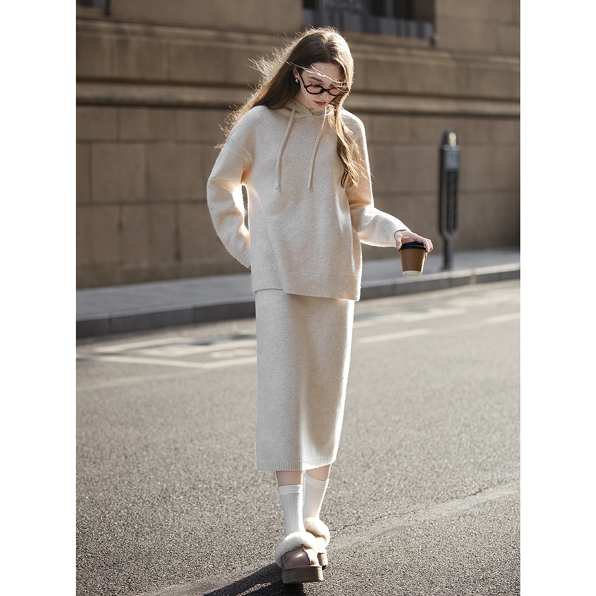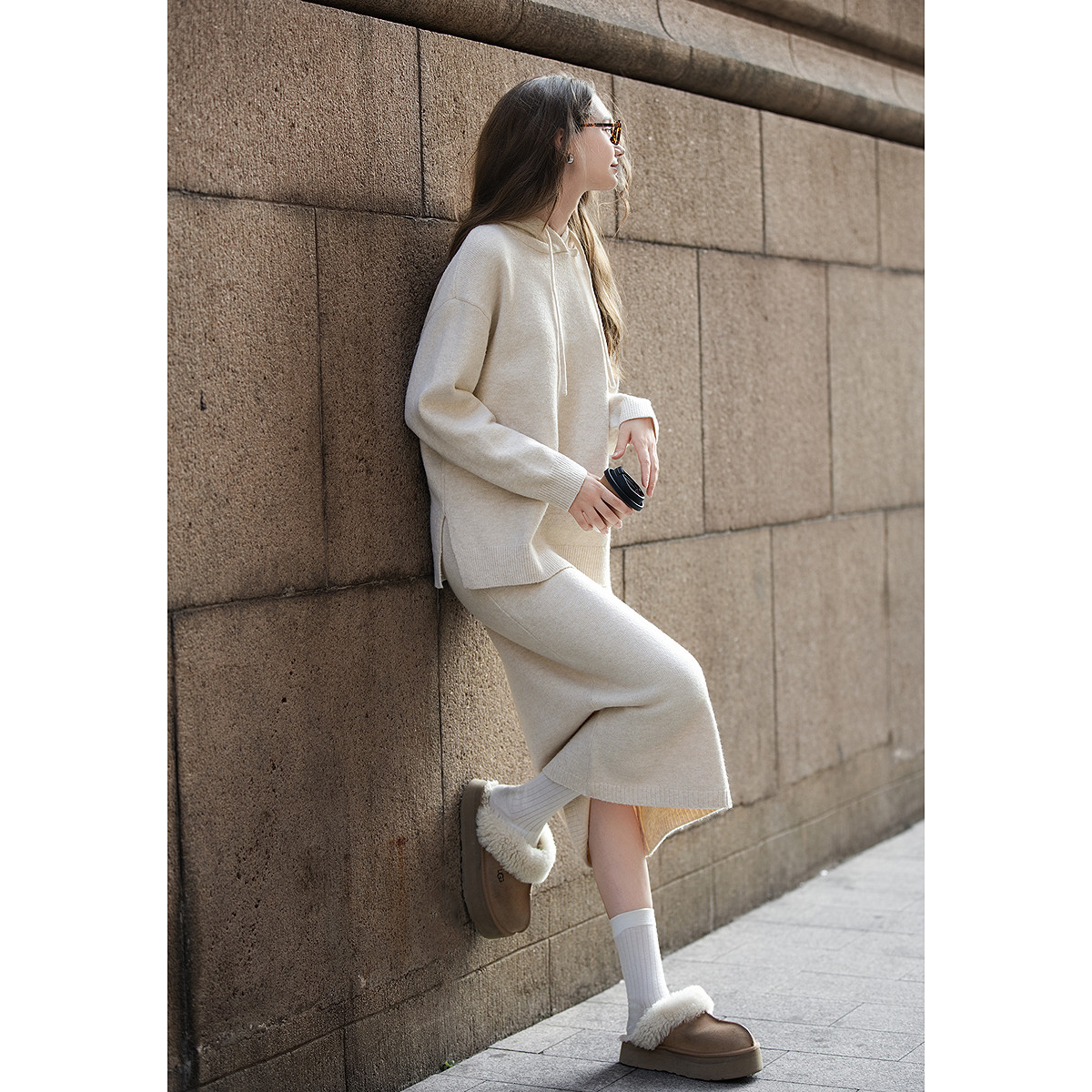 唐狮秋冬毛衣女长裙套装净色连帽毛线衫温柔气质慵懒风高级感tuTA