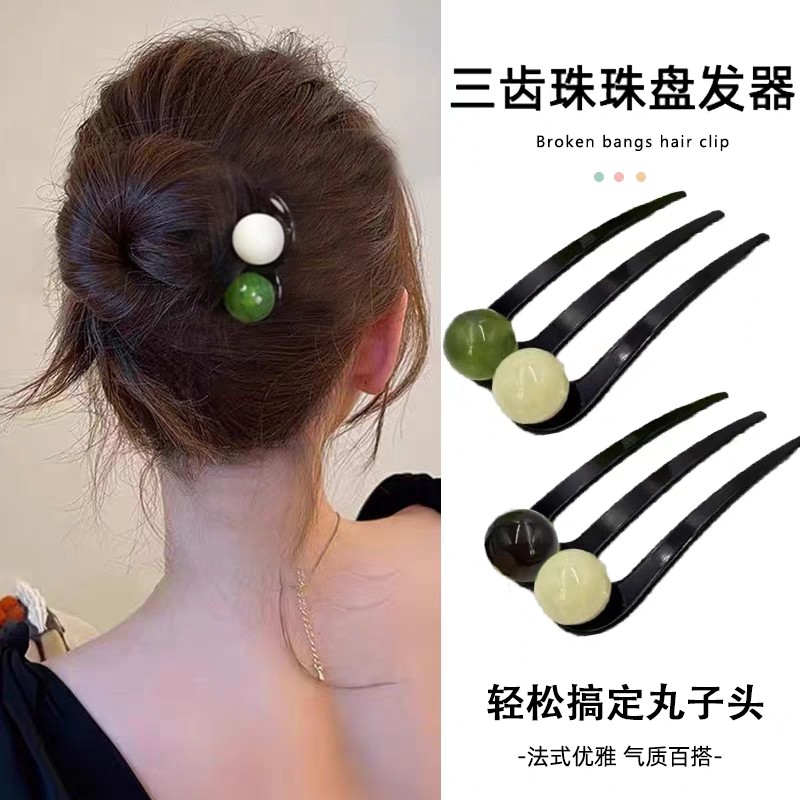 简约爆款珠珠三齿发簪女百搭气质簪子后脑勺盘发神器头饰时尚发钗