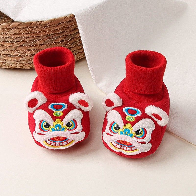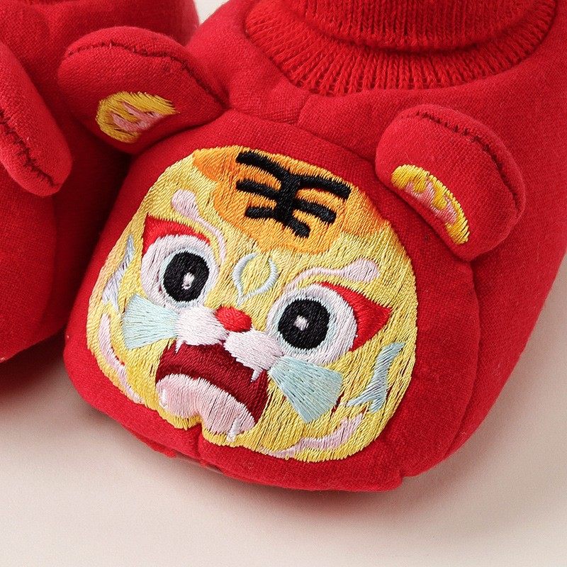 婧麒婴儿鞋子冬款加绒加厚0-1岁宝宝红色过年虎头鞋袜新生儿软底