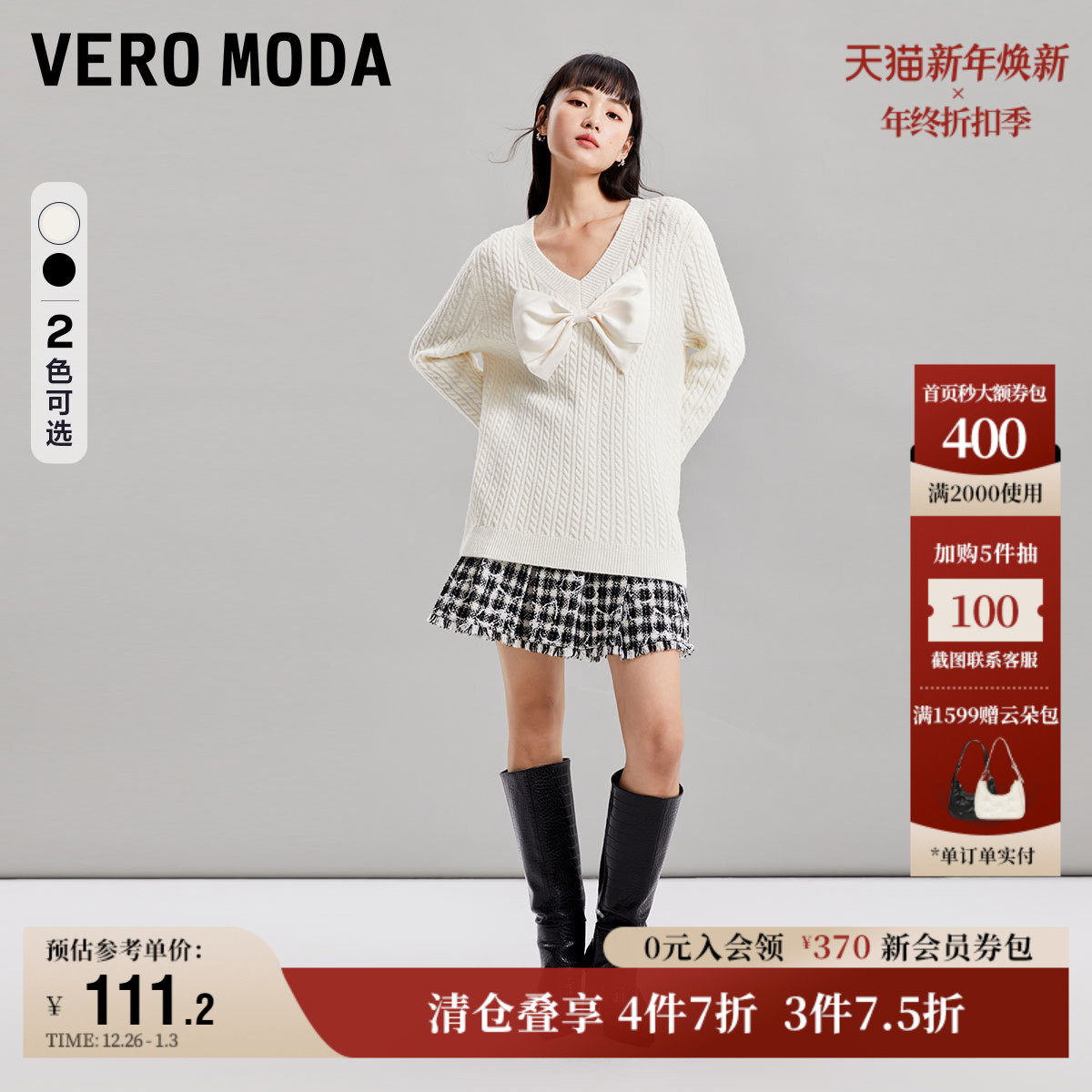 Vero Moda奥莱针织衫女秋冬清仓宽松V领蝴蝶结甜美绞花毛衣百搭