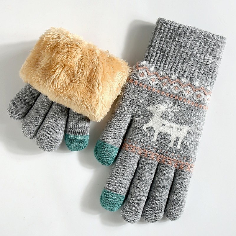 触屏手套女冬季保暖双层加绒加厚男户外骑车小鹿毛线针织手套