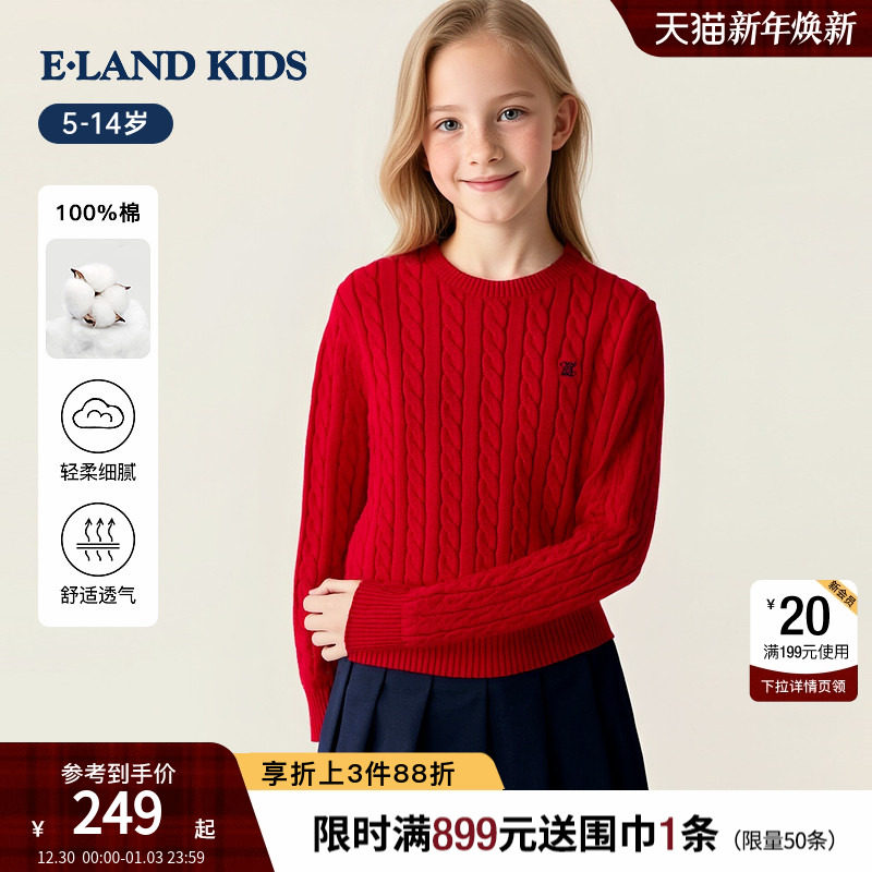 【100%棉】eland kids衣恋童装女童针织衫25秋冬新品圆领刺绣毛衣