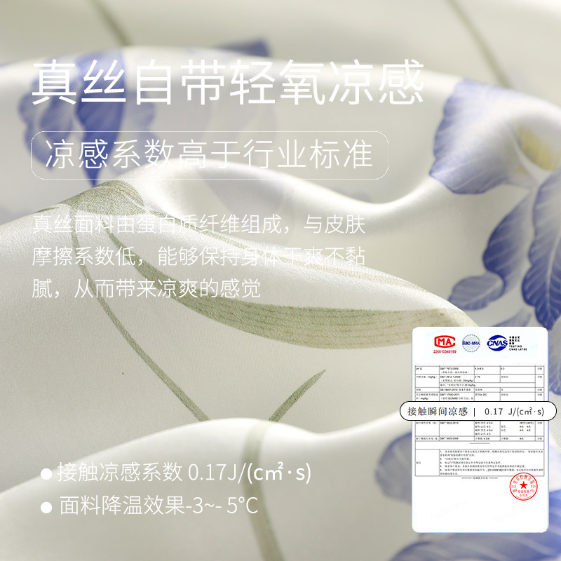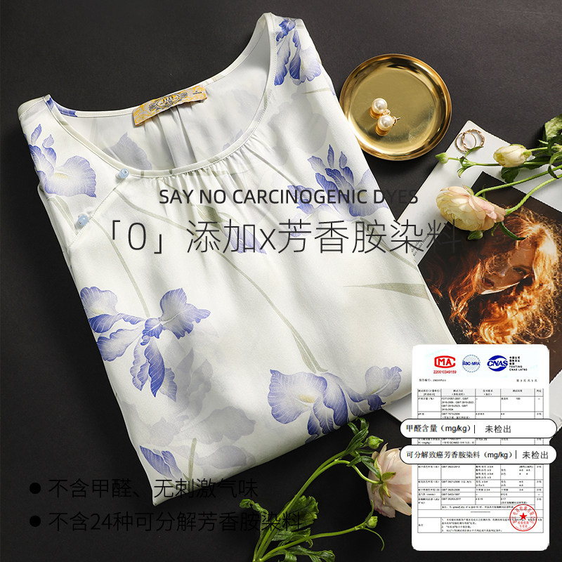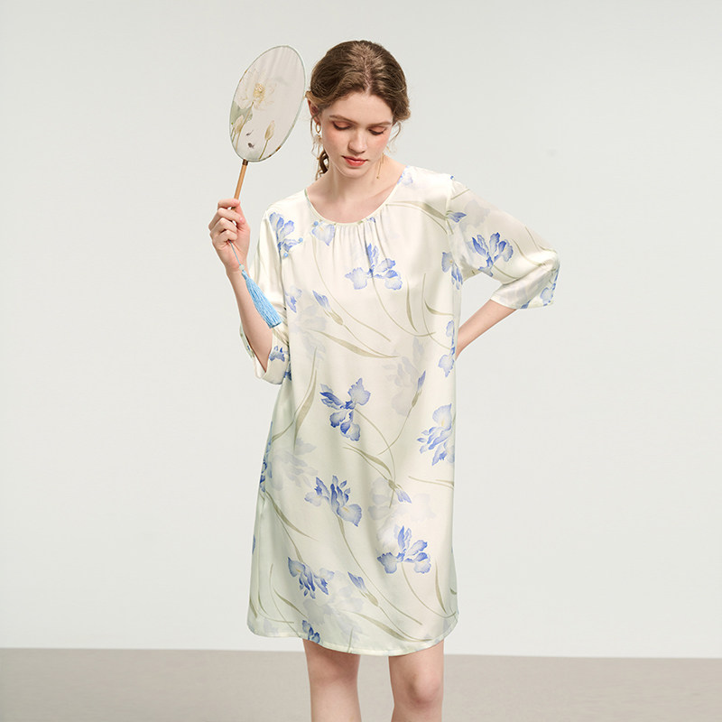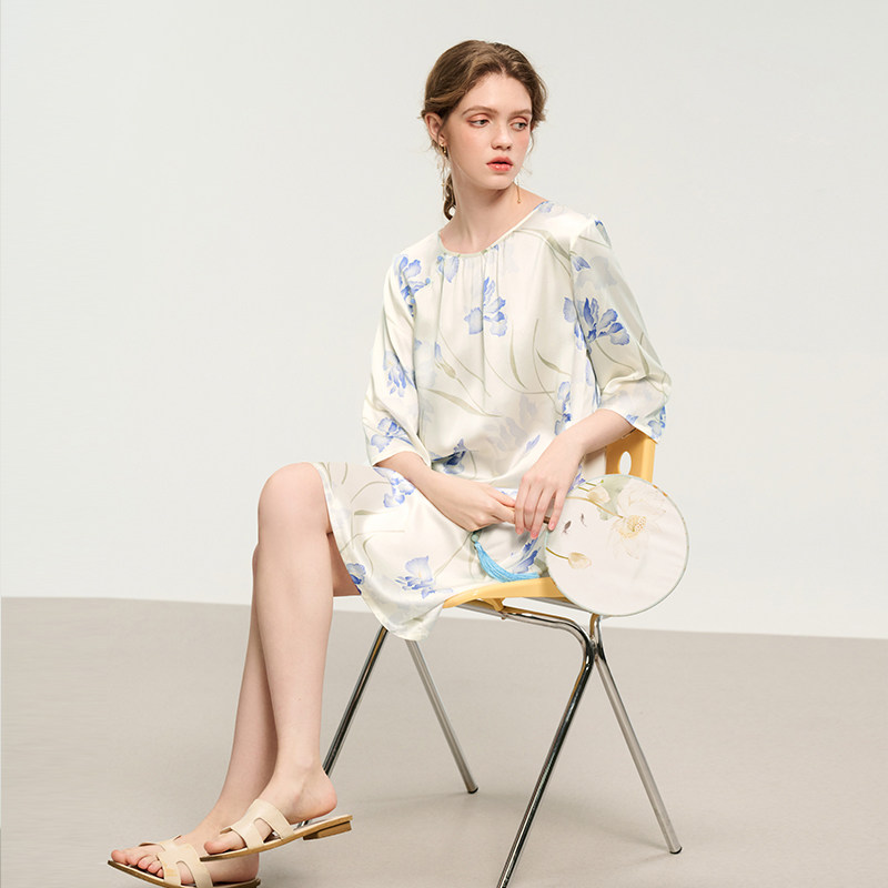 美标真丝睡裙女夏桑蚕丝睡衣中国风丝绸家居服七分袖宽松休闲睡衣