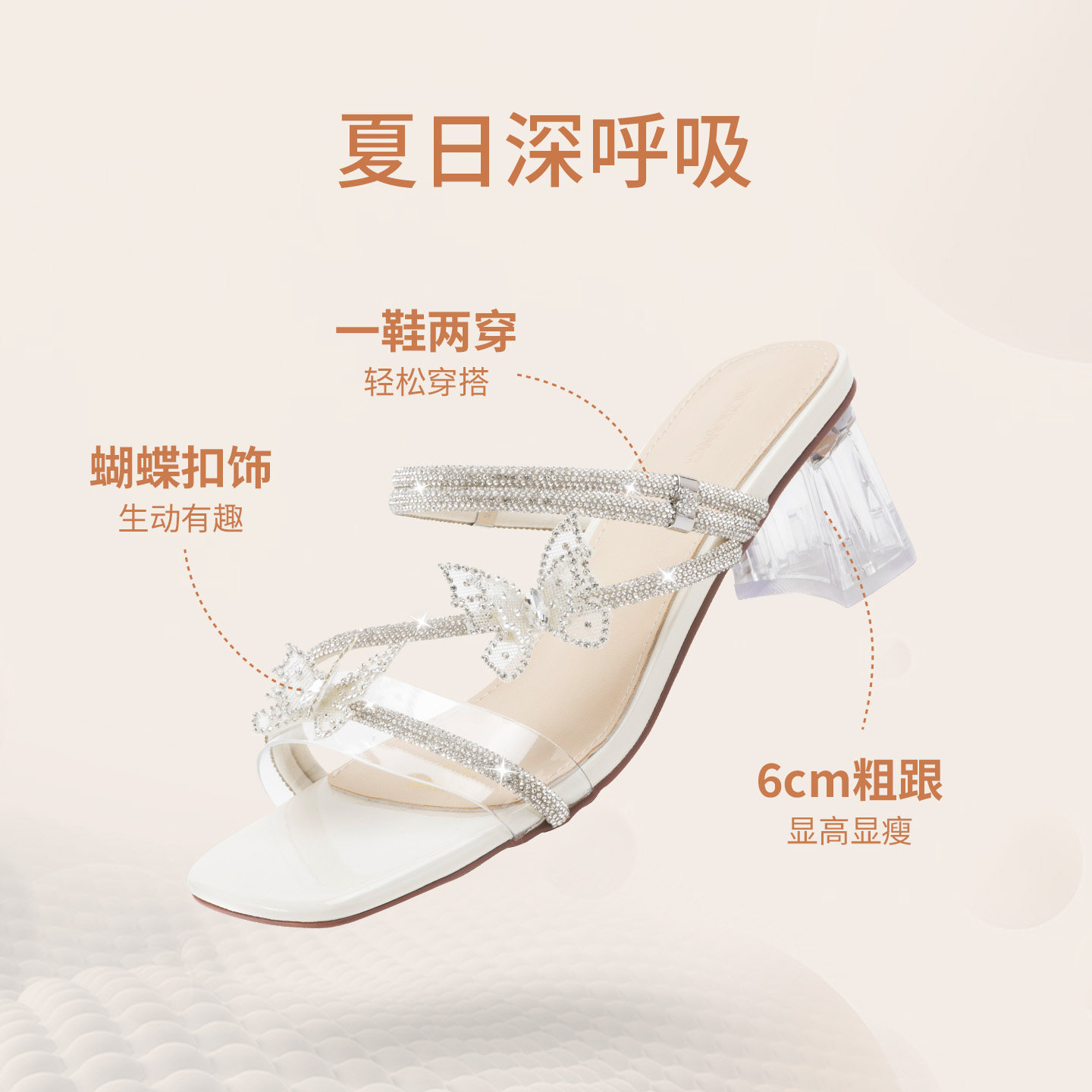奥康 女鞋2026夏季新款中粗跟水钻蝴蝶装饰两穿西式婚礼凉拖鞋