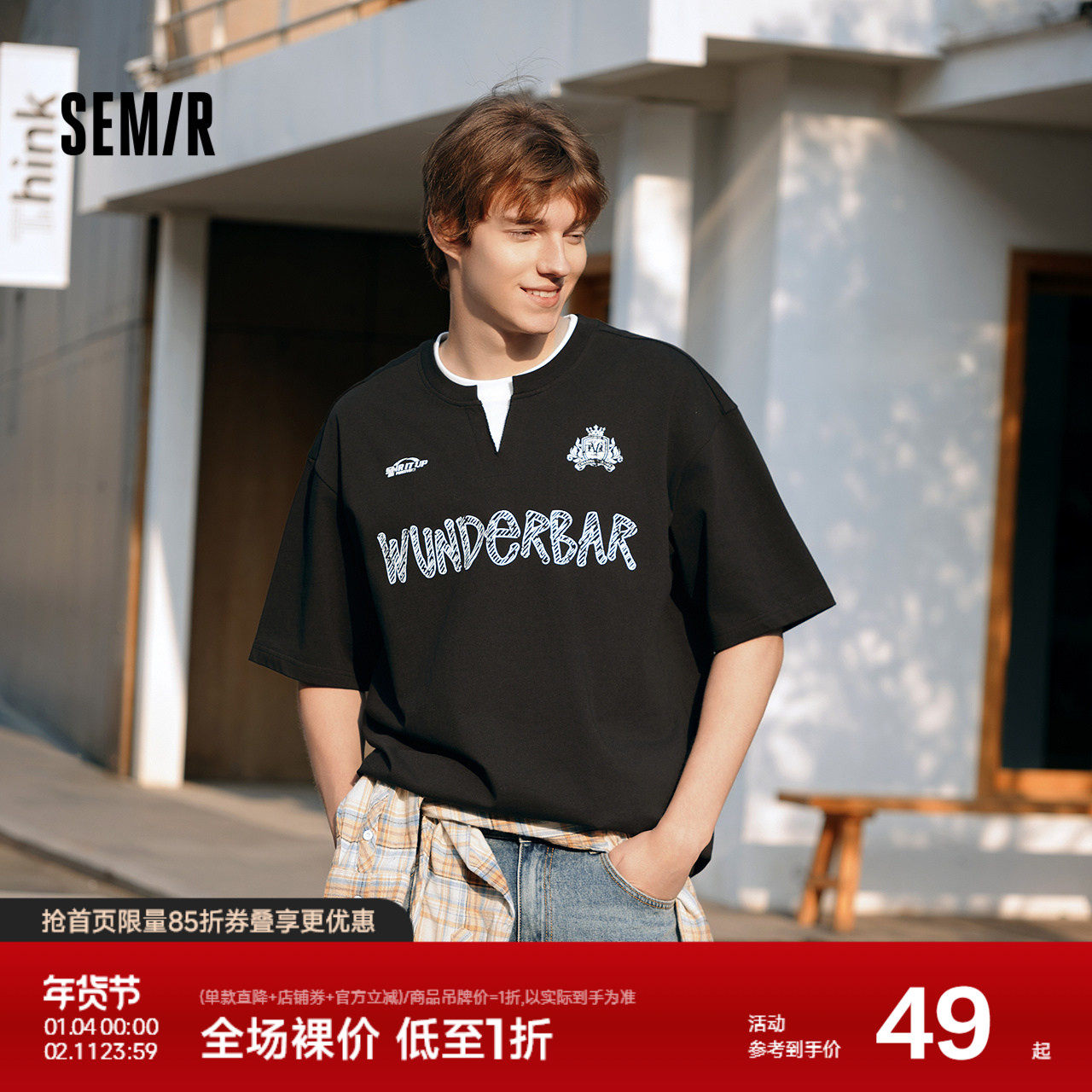 森马短袖T恤男拼接假两件上衣复古学院运动风2025新款夏装宽松潮