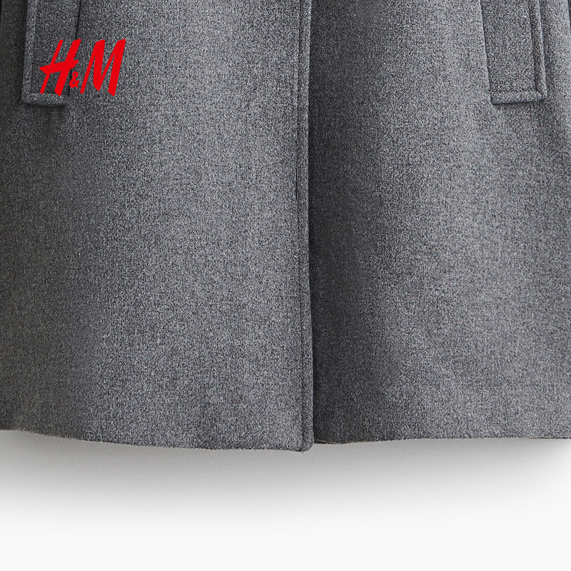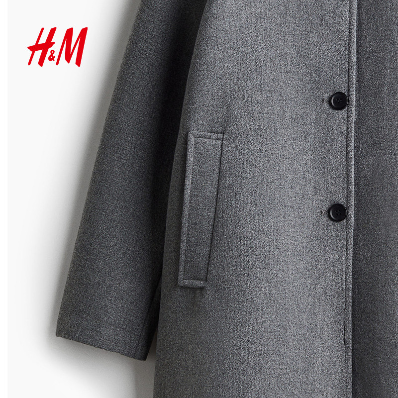 HM女装毛呢外套冬季宽松毛毡纽扣翻领及膝大衣1255546
