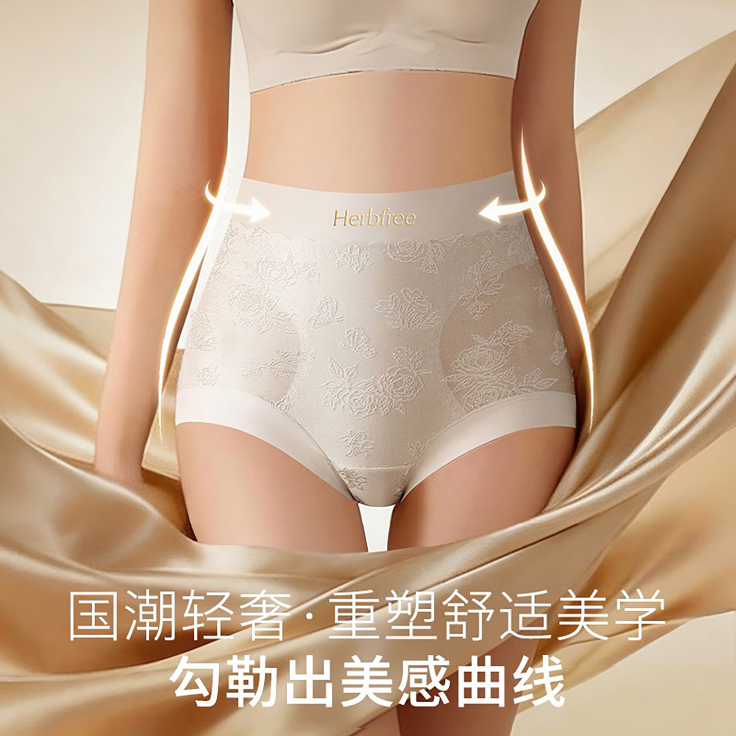 草本初色山茶花精油中高腰国风浮雕加长裆全包裹无痕轻塑内裤女士