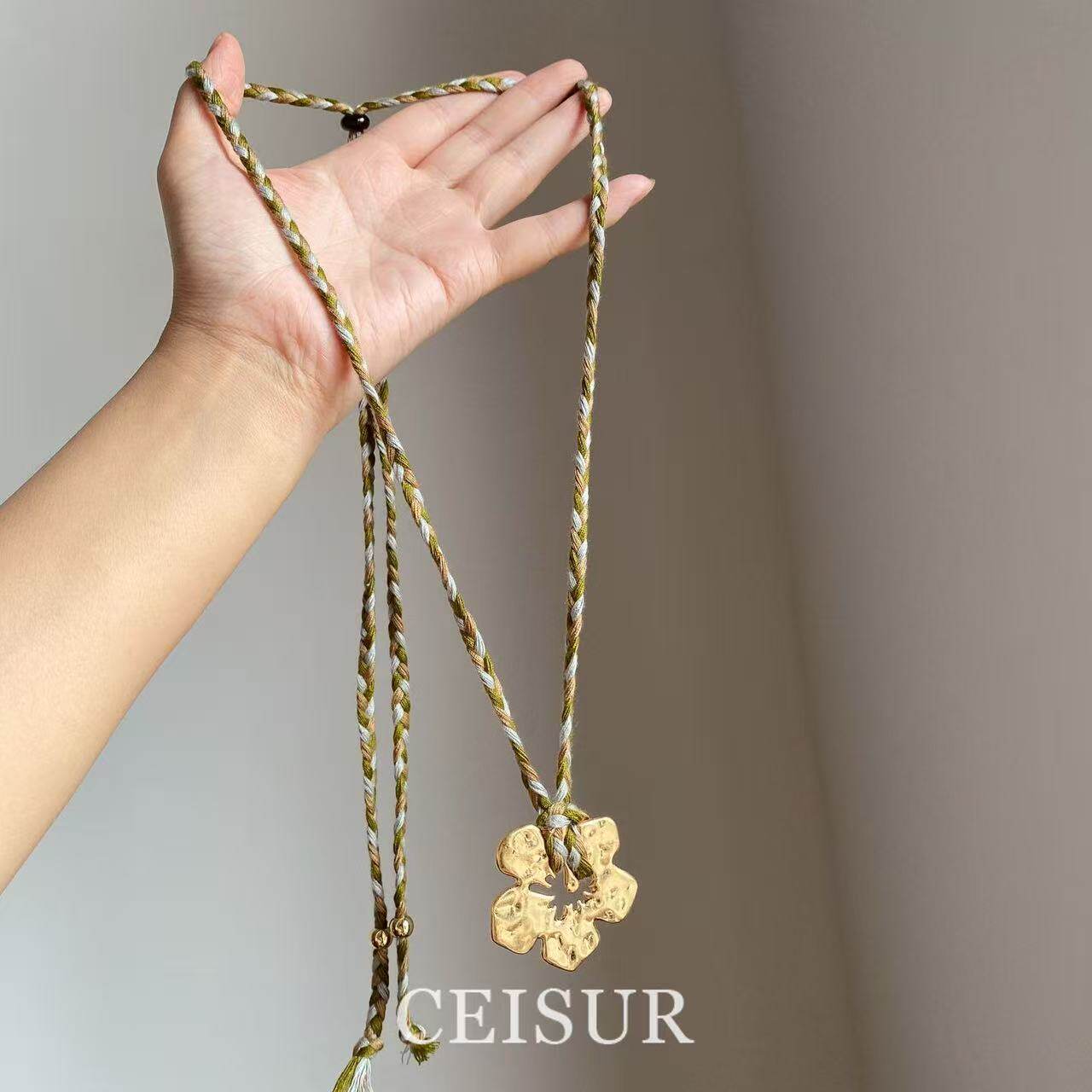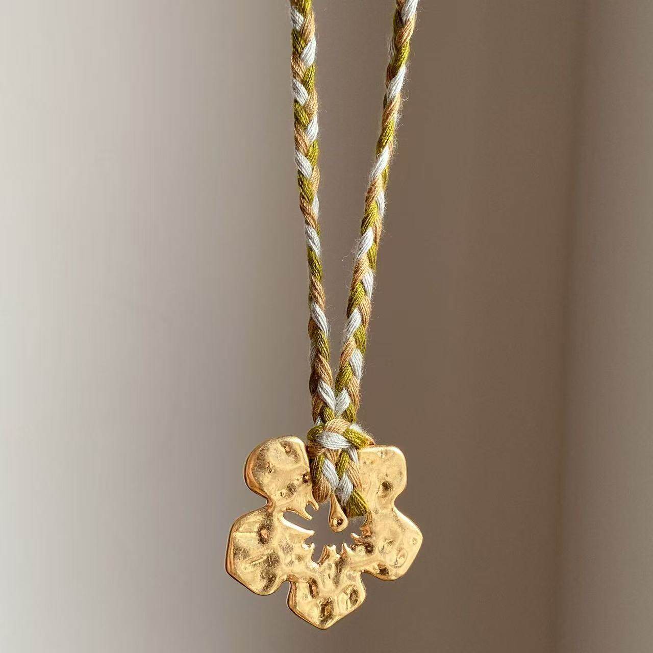 扶桑花~ins博主同款复古金色花朵穿绳项链个性时尚度假风编织颈链