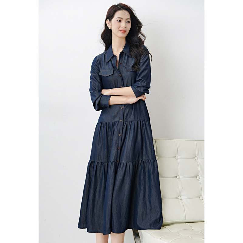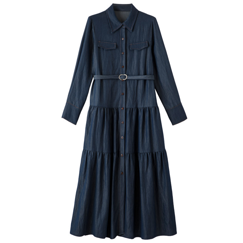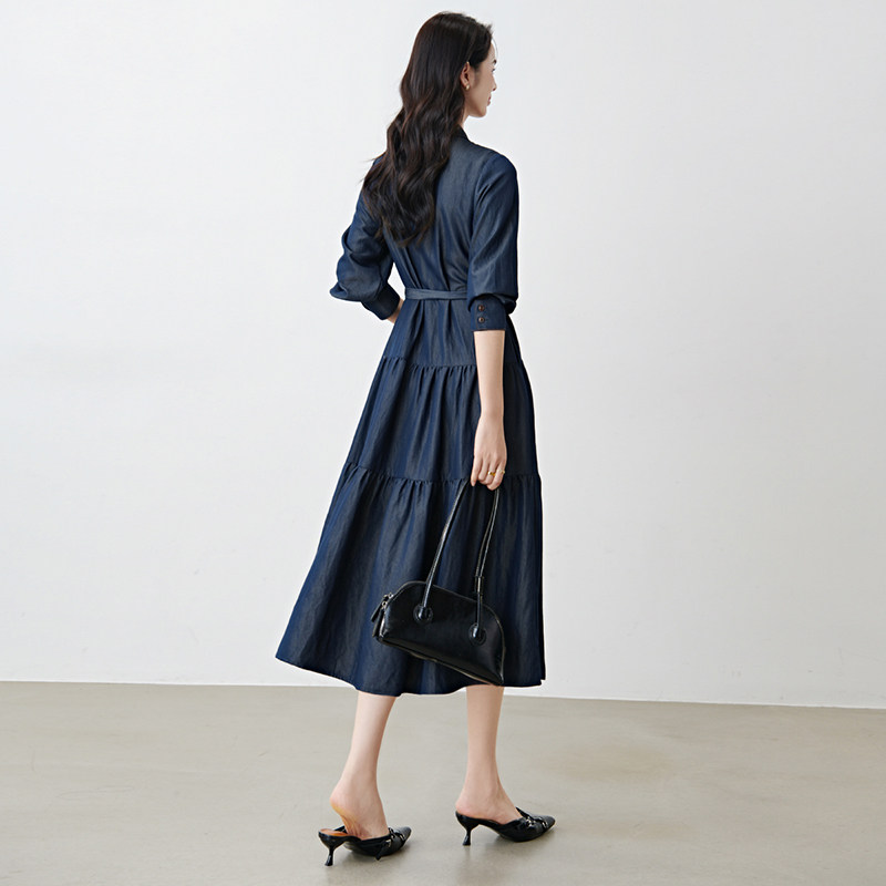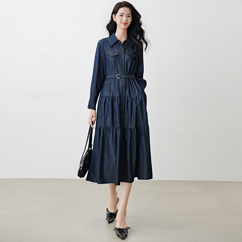 晚白2026年春新款经典丹宁蓝翻领牛仔衬衫裙系带收腰大码连衣裙