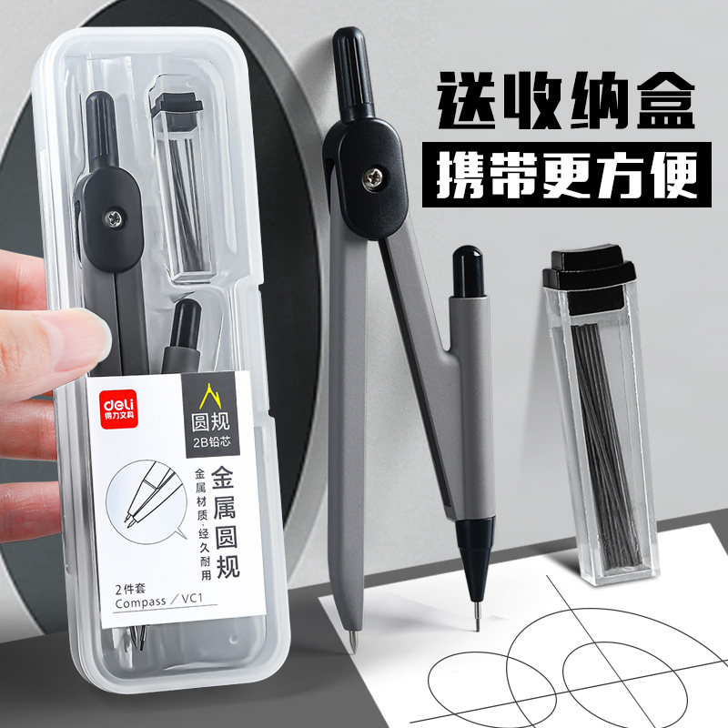 得力圆规学生用实用型数学几何教学中高考考试用金属圆规小学初高中生可替换笔芯绘图按动出芯圆规文具用品