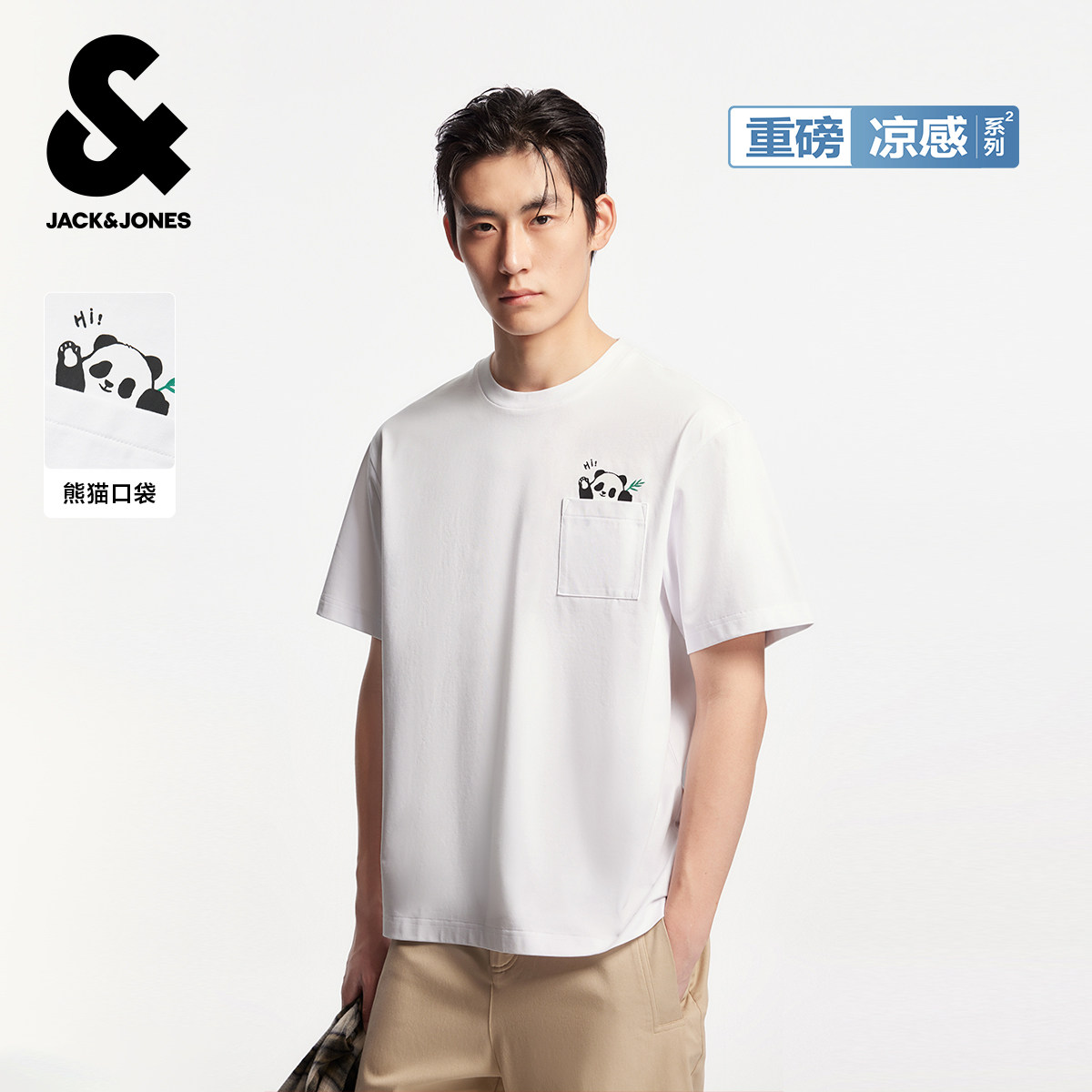重磅棉杰克琼斯男装秋季宽松打底水墨熊猫短袖刺绣T恤父亲节礼物