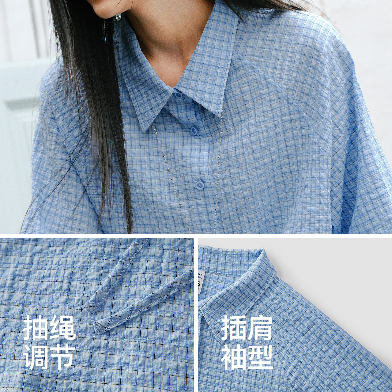 森马长袖衬衫女春中长款插肩袖格纹肌理抽绳2026新款慵懒文艺上衣