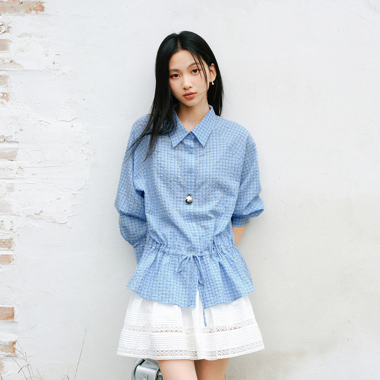抽绳款可凹裙摆造型 清新文艺蓝白格纹
