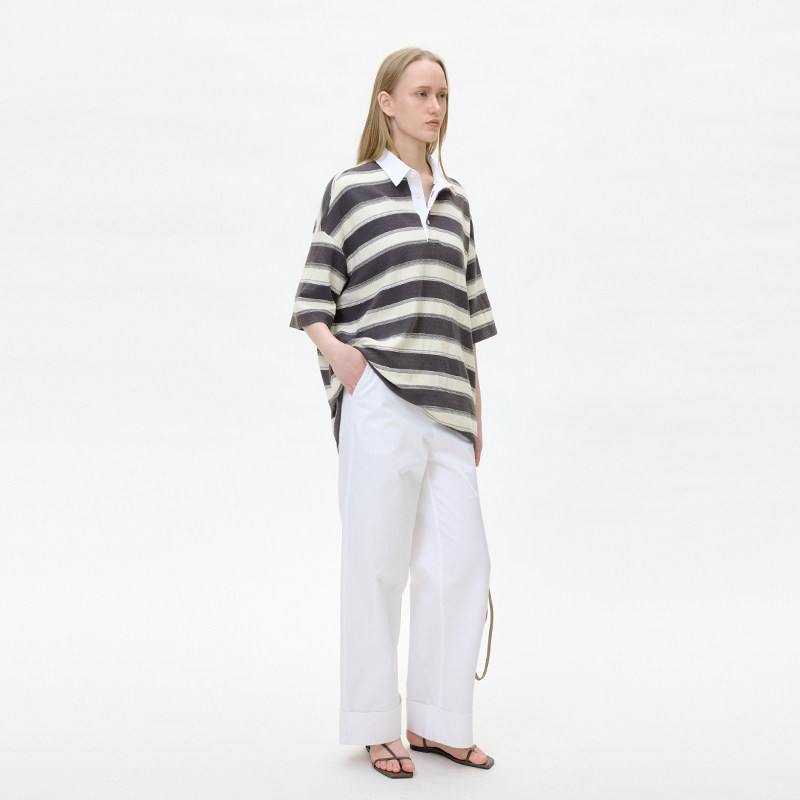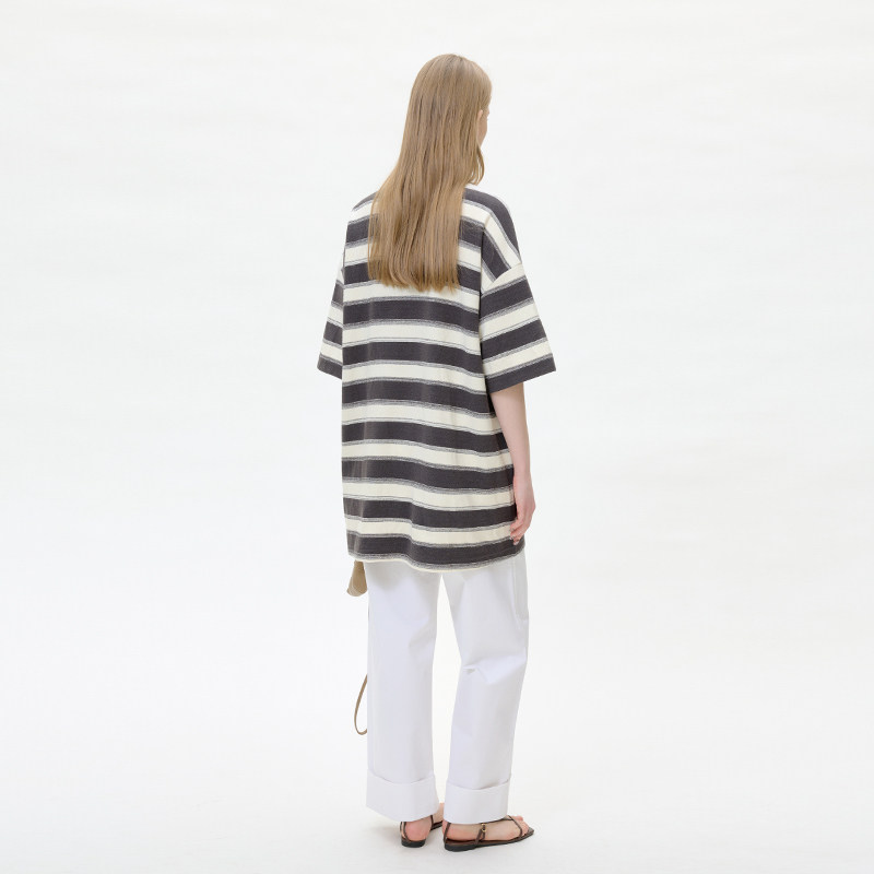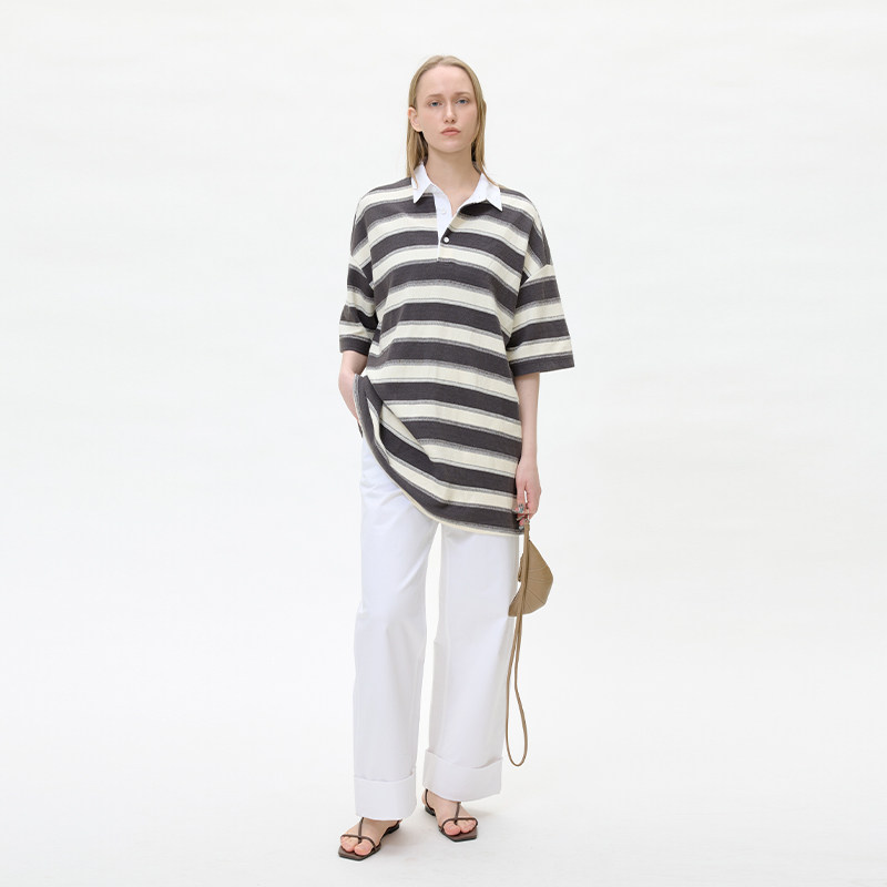2026新款外贸单全棉短袖针织T恤打底衫Polo领花纱刺绣条纹FQ24218