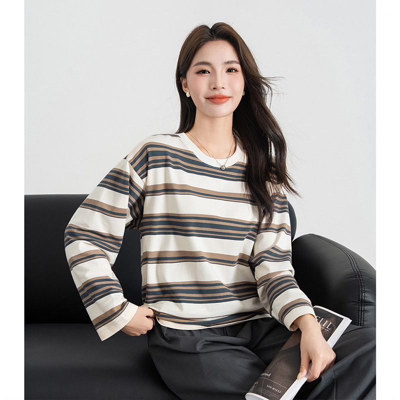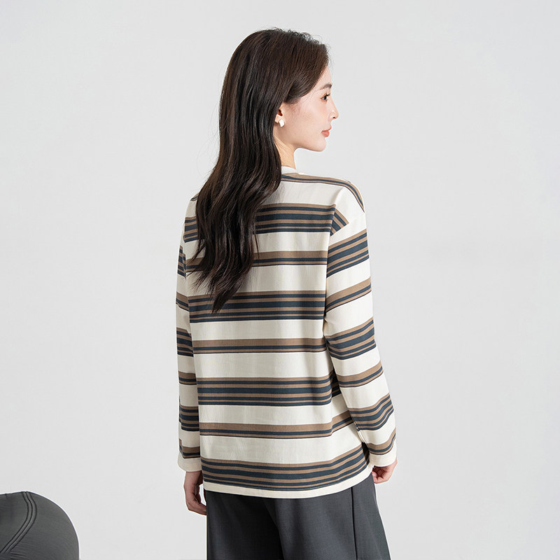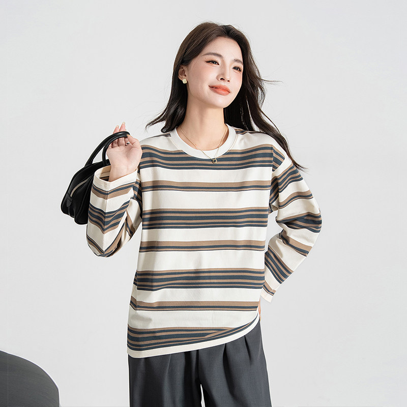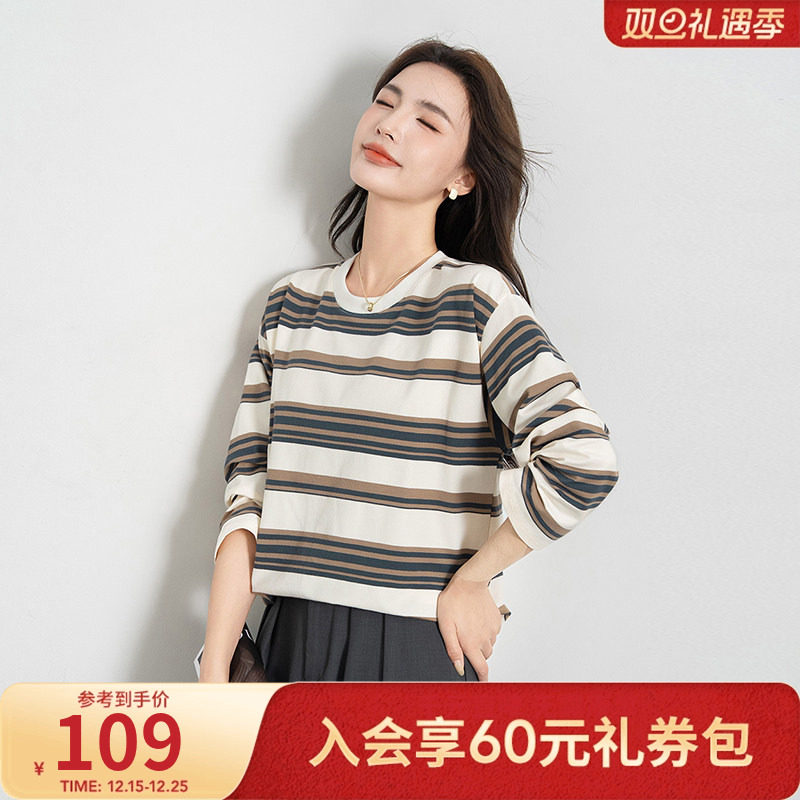 热风女士经典撞色复古宽松条纹长袖T恤秋季女款百搭休闲通勤内搭