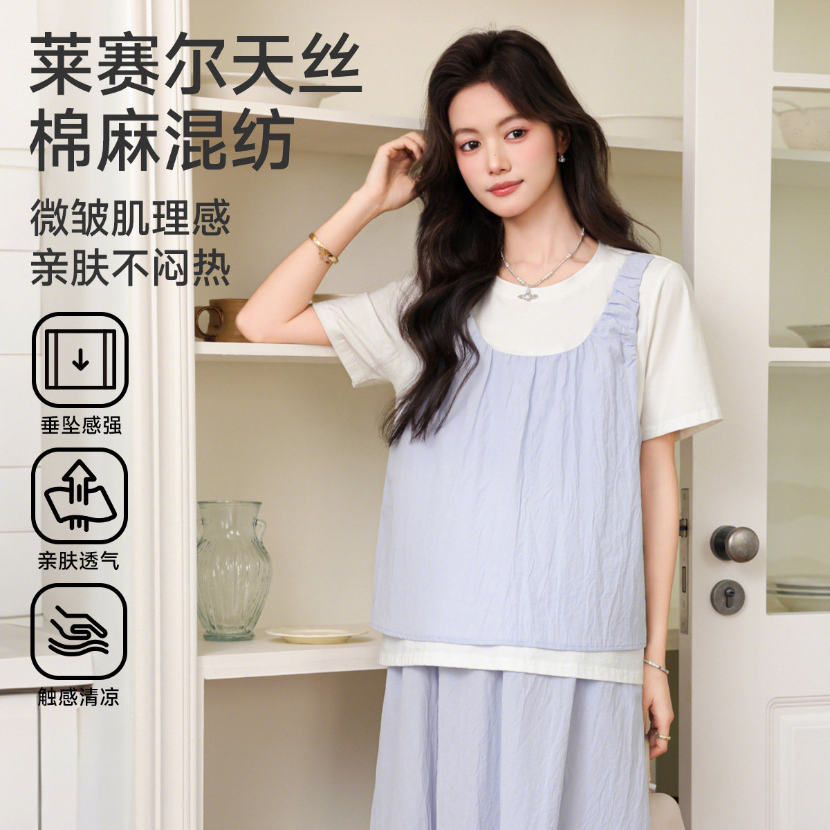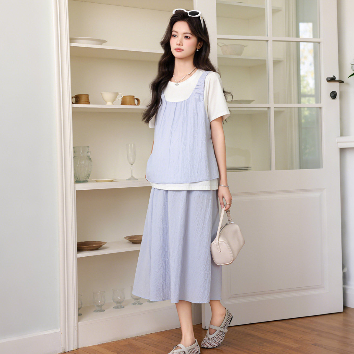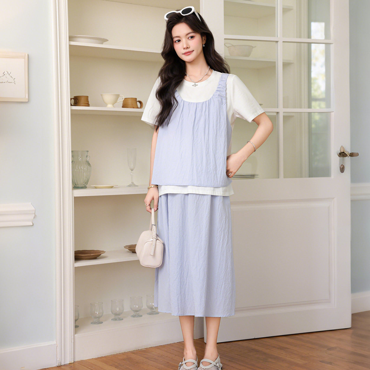 婧麒孕妇套装假两件套装女夏季休闲显瘦不显怀洋气孕妇装时尚减龄