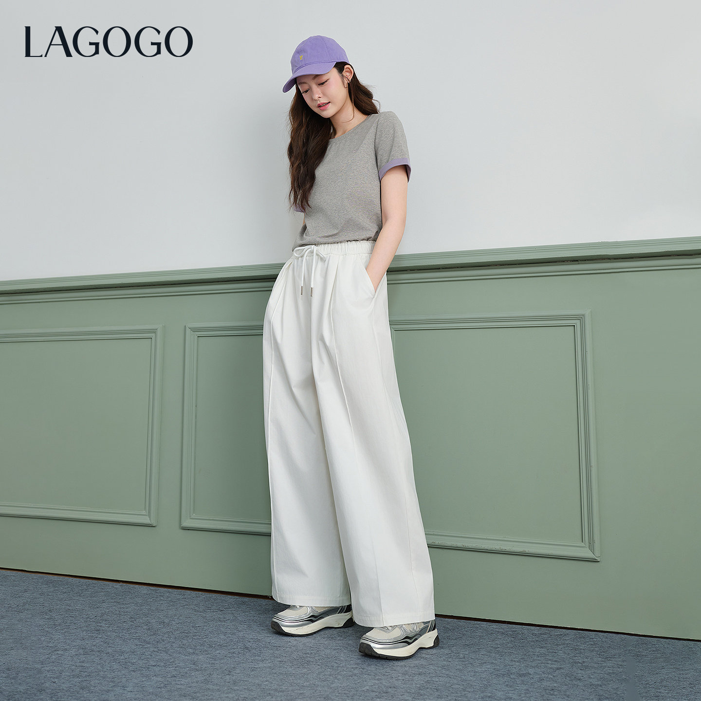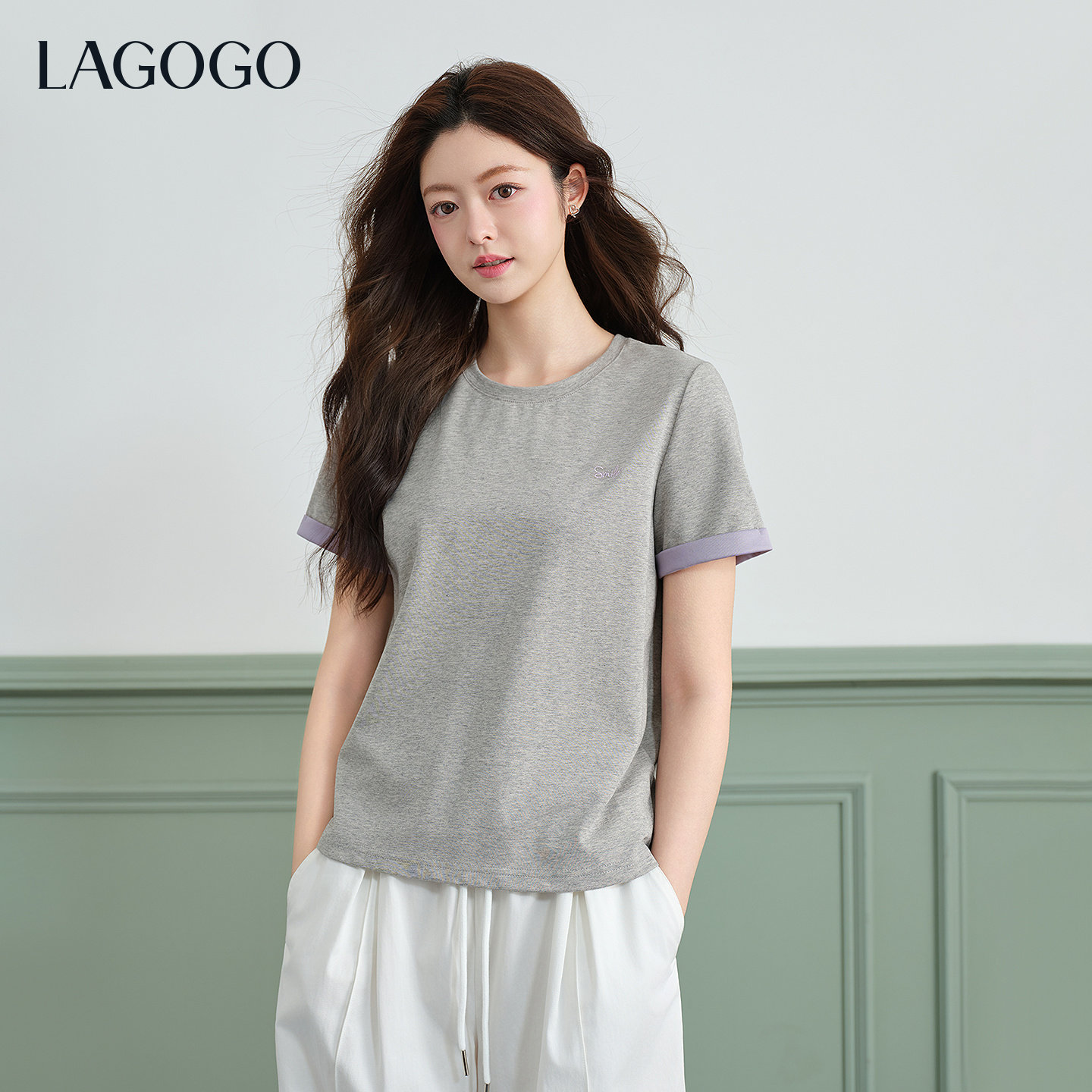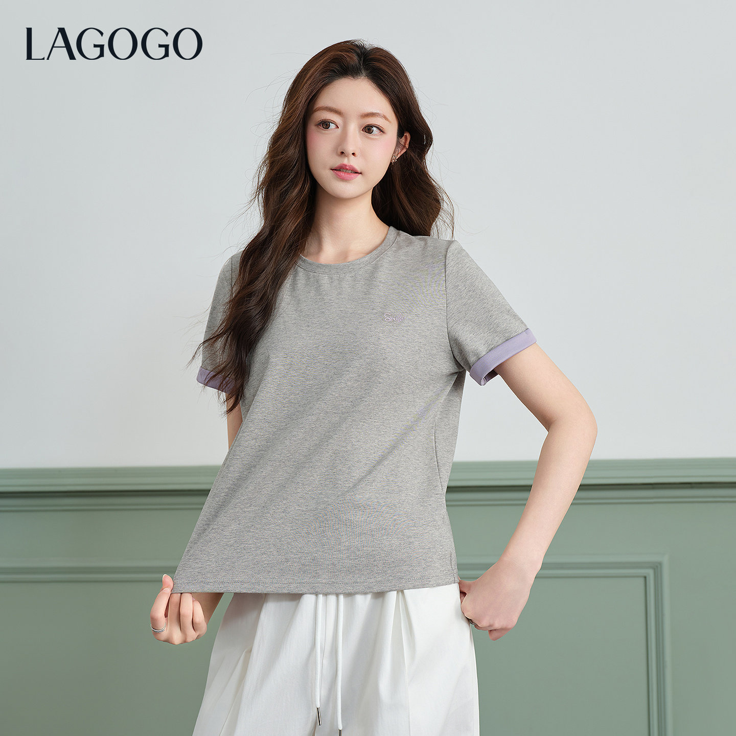 LAGOGO紫色双面针织T恤女拉谷谷2026春新款撞色翻边正肩短袖上衣