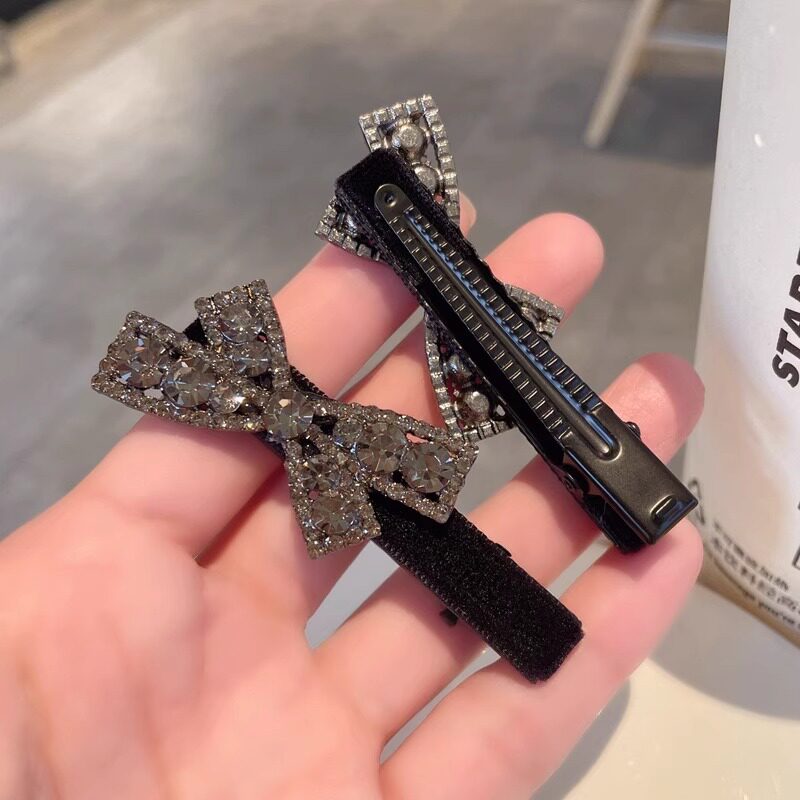 前额蝴蝶结水钻鸭嘴夹简约丝绒刘海夹黑色碎发夹侧边夹发卡发饰