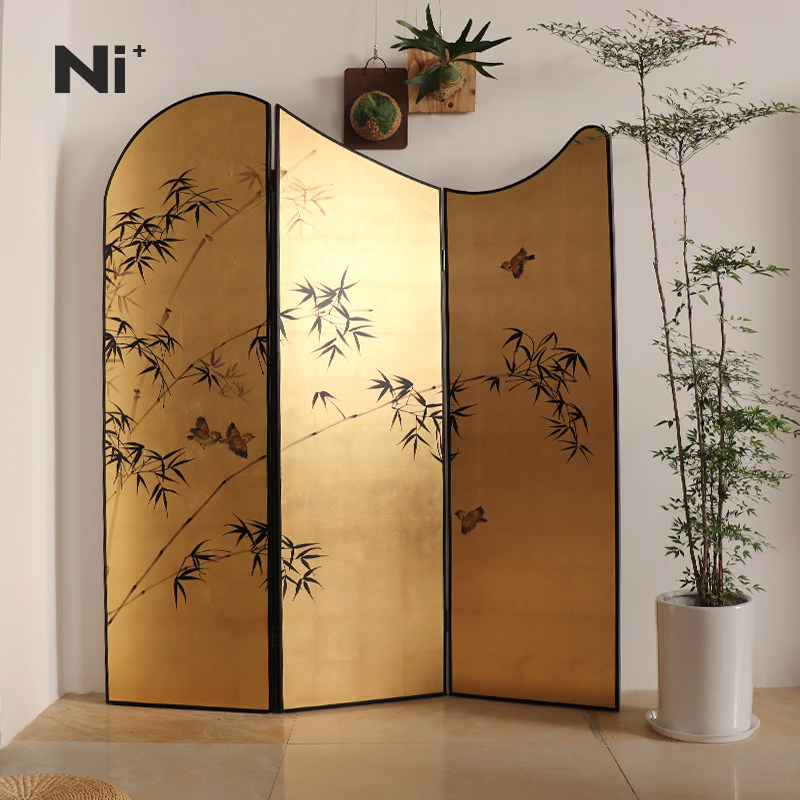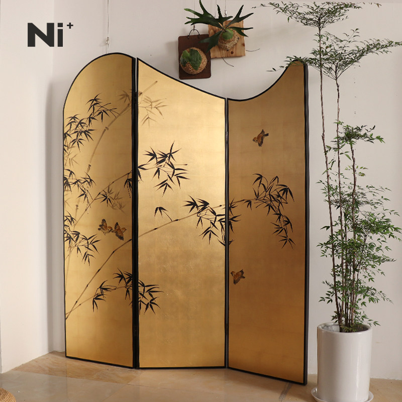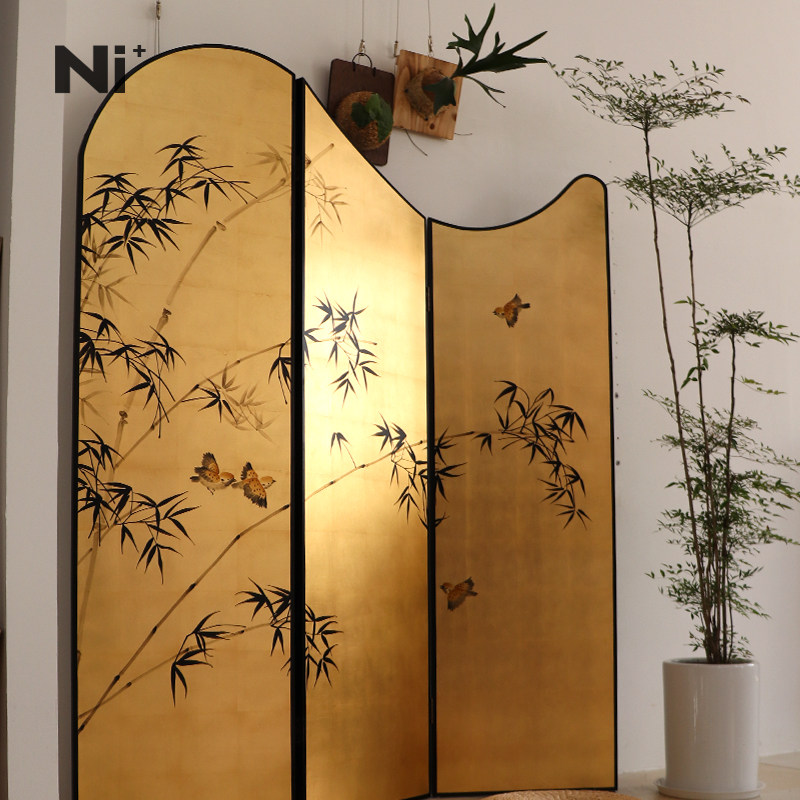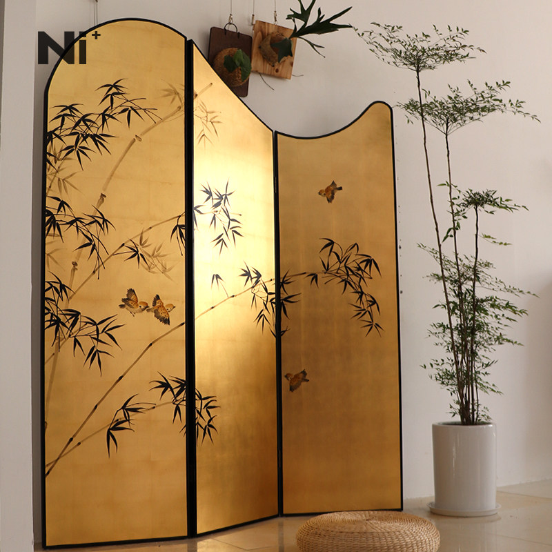 Ni尼家法式中古风屏风金箔中国风手绘竹子漆画客厅茶空间折叠屏风