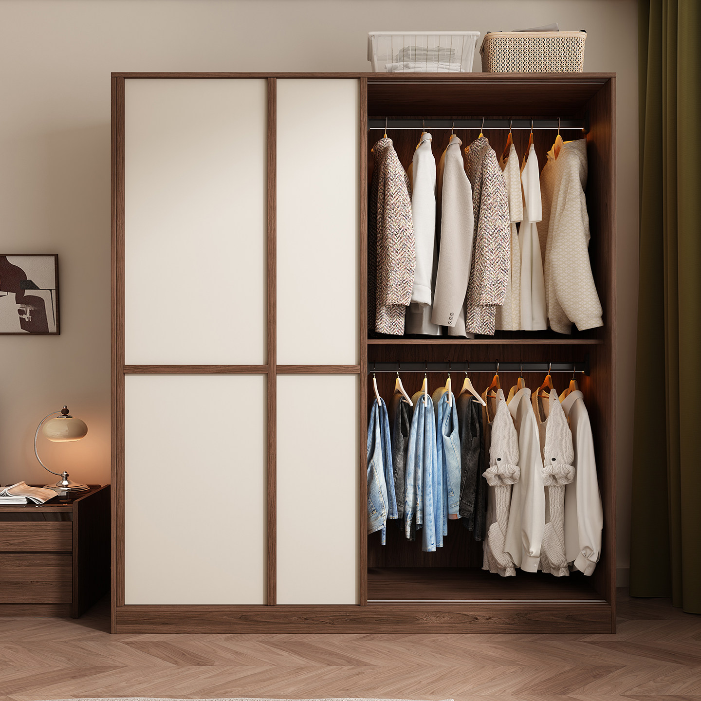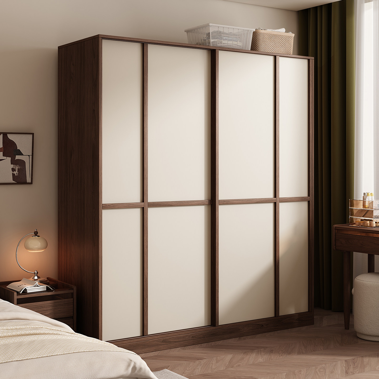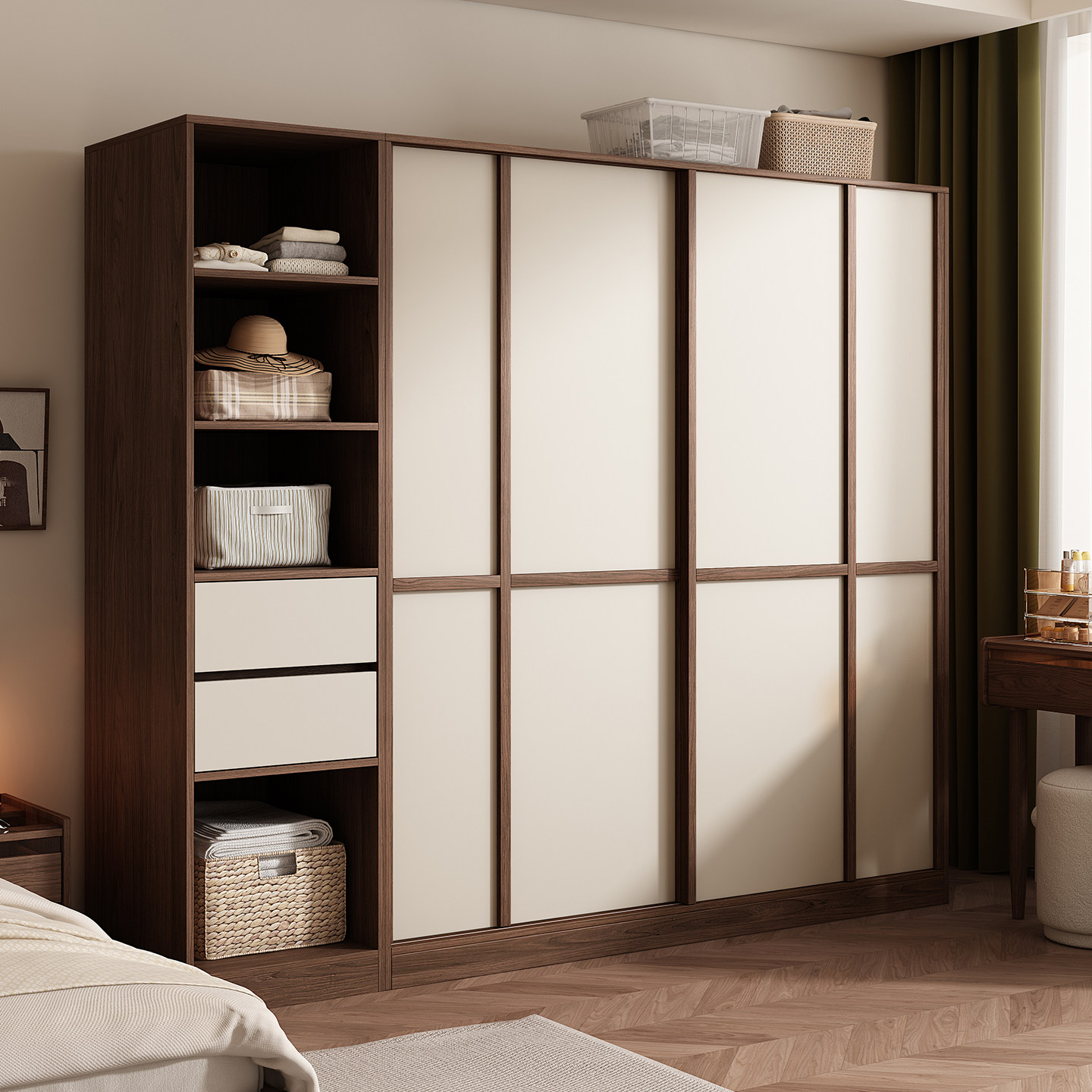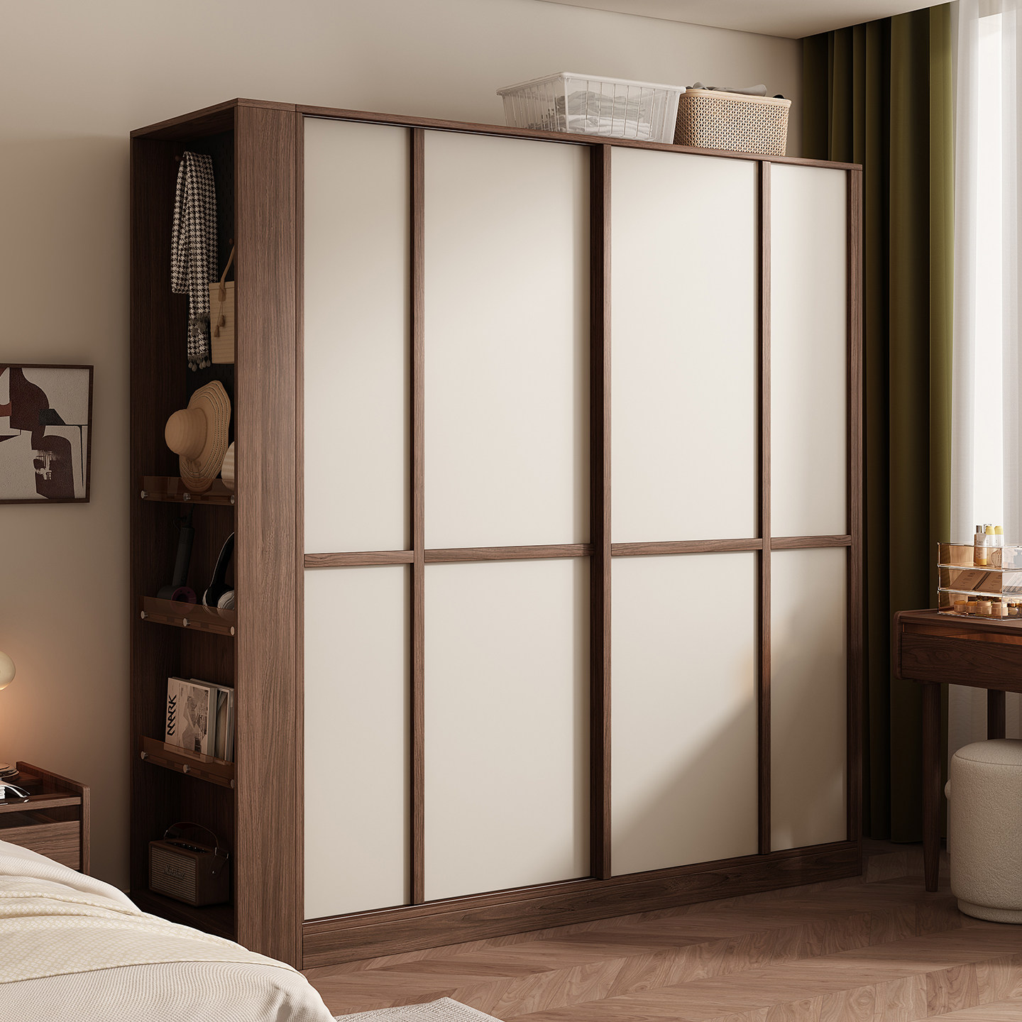 木兜家具格序衣柜胡桃色卧室小户型实木骨骼线推拉门中古风大衣橱