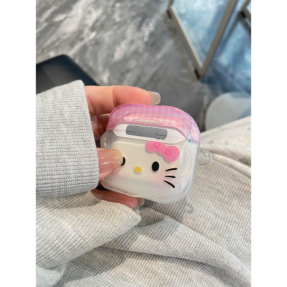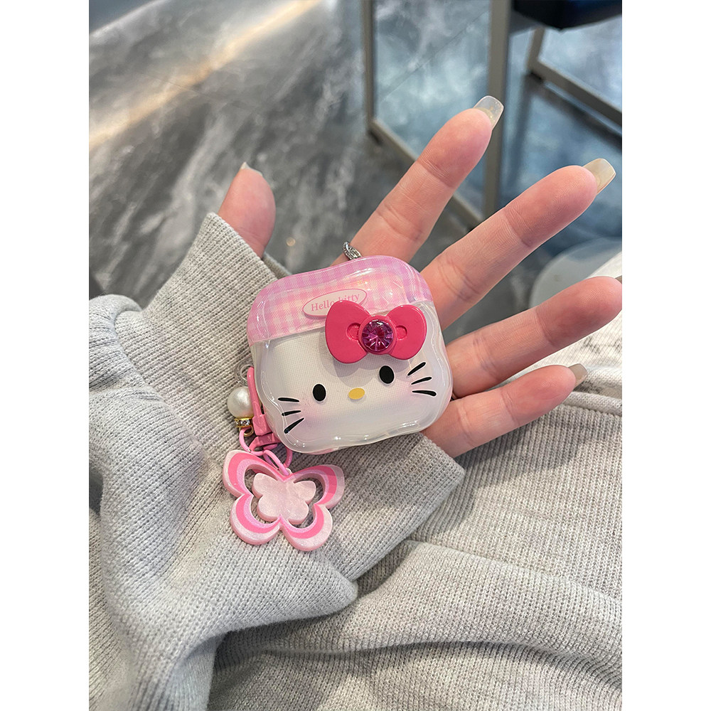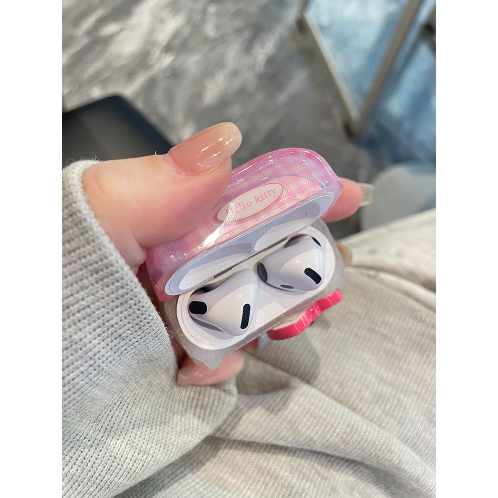日韩粉格纹拼接蝴蝶结Kitty猫适用苹果Pro3蓝牙AirPodsPro耳机壳AirPods4代软AirPods1/2硅胶3代防摔套Pro2代
