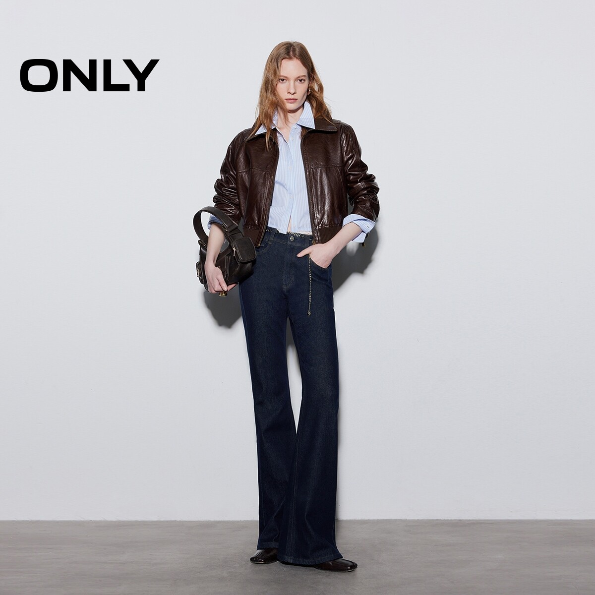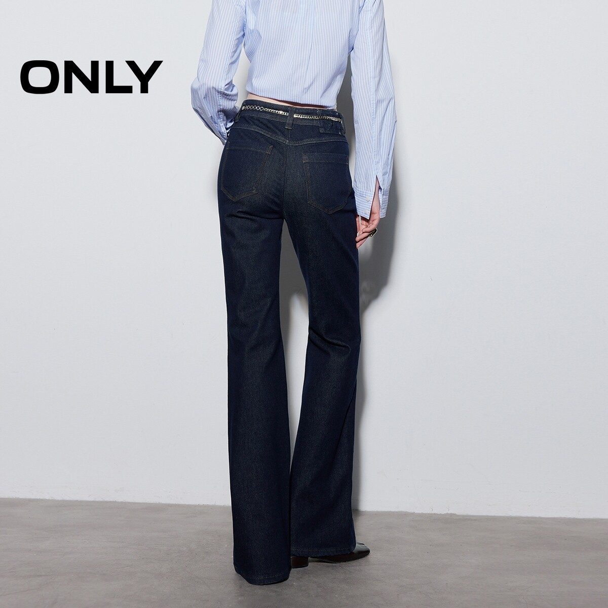 ONLY2026春季新款金属腰链磨毛舒适高腰修身喇叭裤裤子牛仔裤女