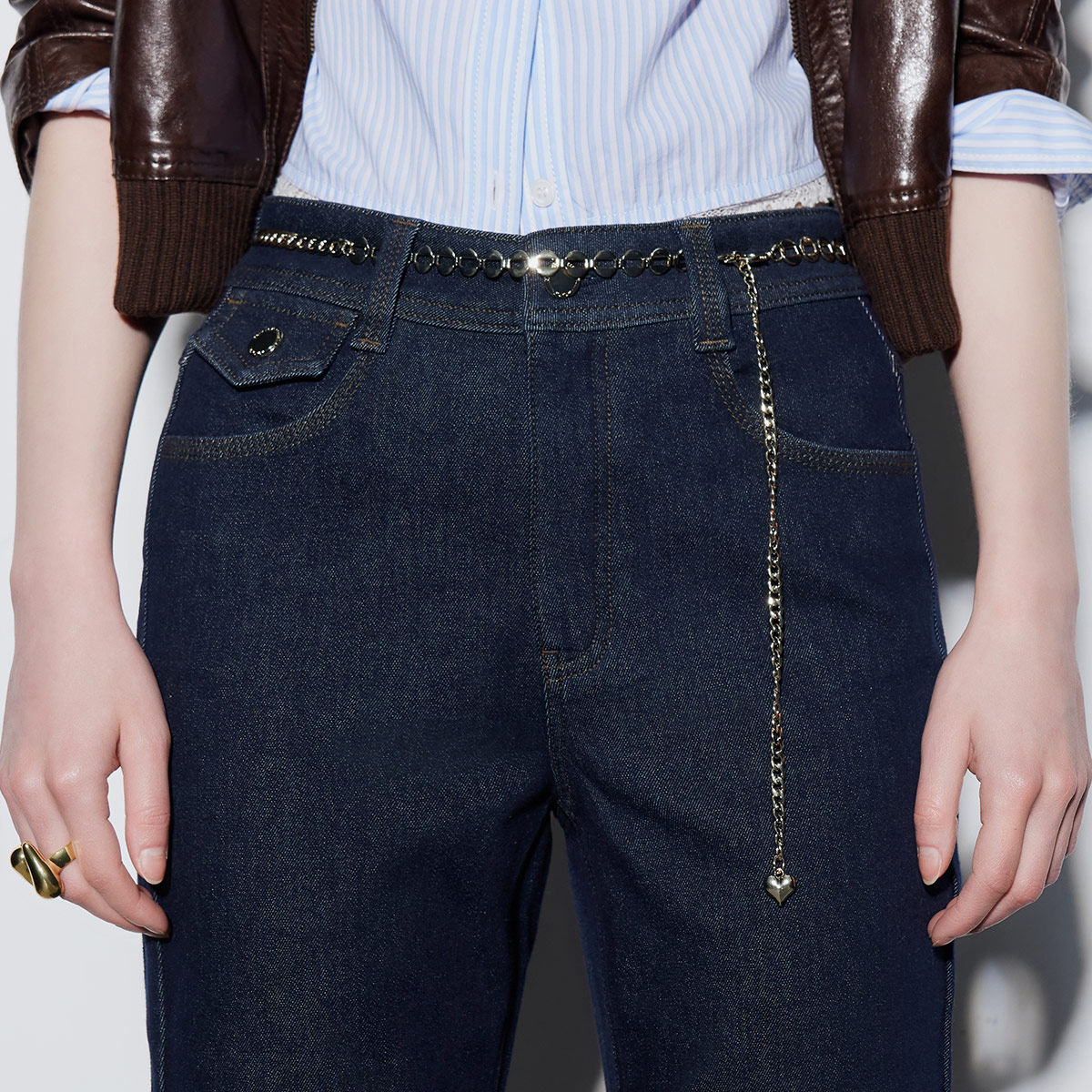 拉长腿型微喇裤,闪亮重工金属腰链
